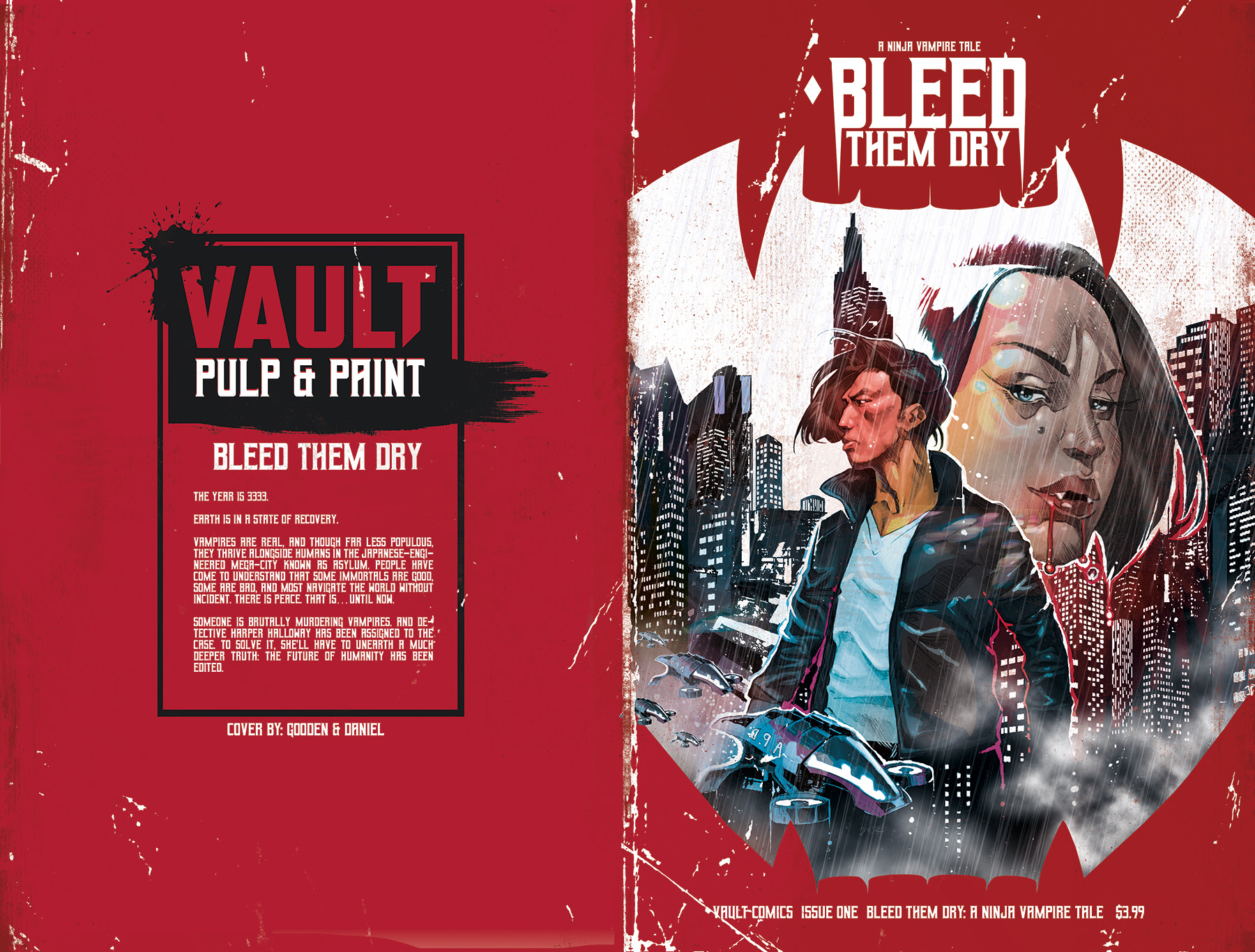 Missoula, MT (3/13/2020): Vault Comics is thrilled to announce, BLEED THEM DRY: A NINJA VAMPIRE TALE, a new comic series created in association with Lotus, Nagoya TV, and F.J. DeSanto. Created by Hiroshi Koizumi, written by Eliot Rahal, drawn by Dike Ruan, colored by Miquel Muerto, and designed by Tim Daniel, BLEED THEM DRY weaves Japanese and Western mythology together to create a deep-future sci-fi epic about Detective Harper Halloway, who's been tasked with capturing an insidious killer: Someone targeting our immortal brethren, the Vampires that have been living beside us peacefully for centuries.