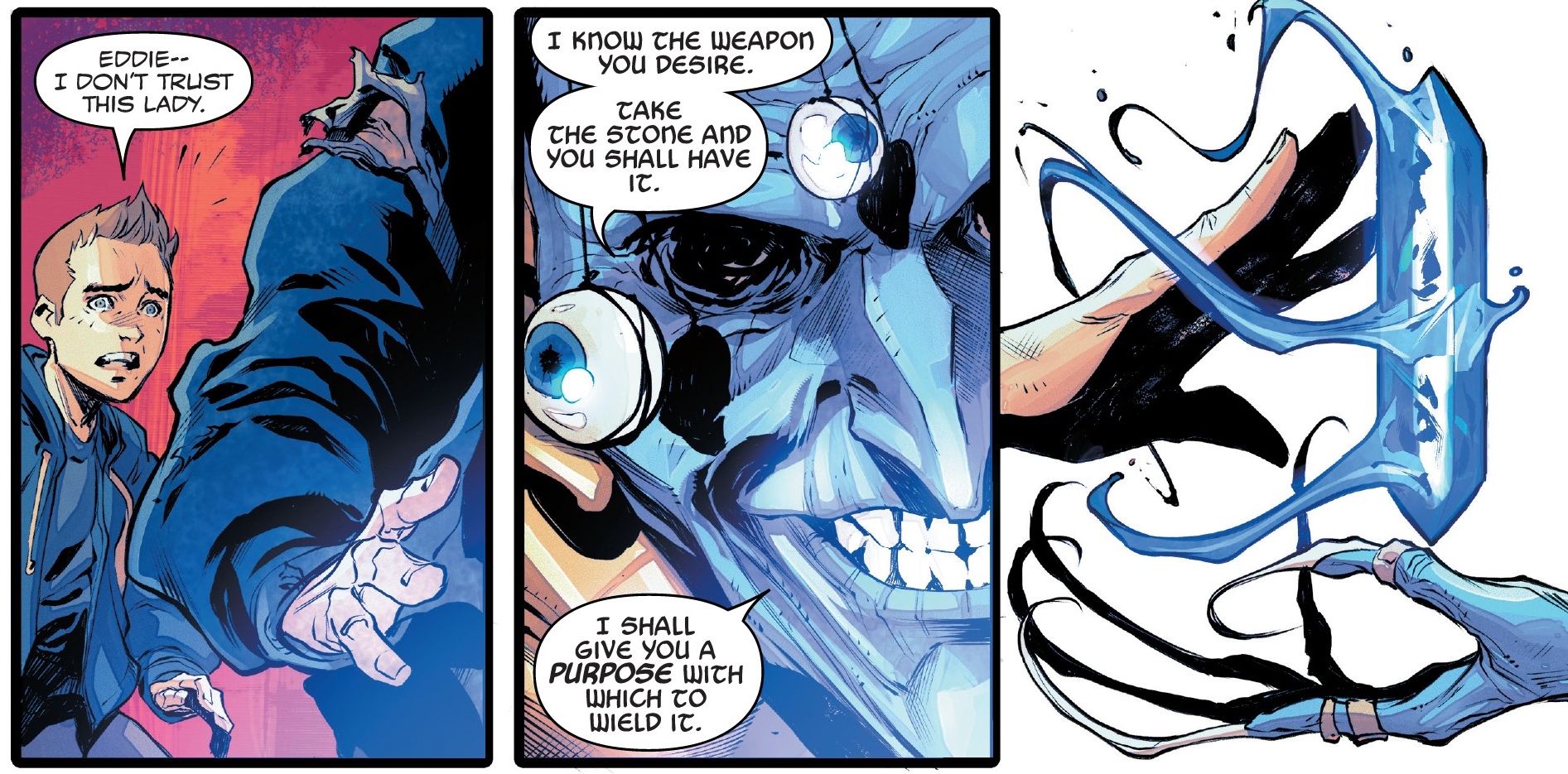 It doesn't bode well for Venom. Ezcept, hang on, didn't we just see Eddie Brock in the most recent Venom #13, and one that was a War Of The Realms crossover, living without his symbiote and in New York, not London…