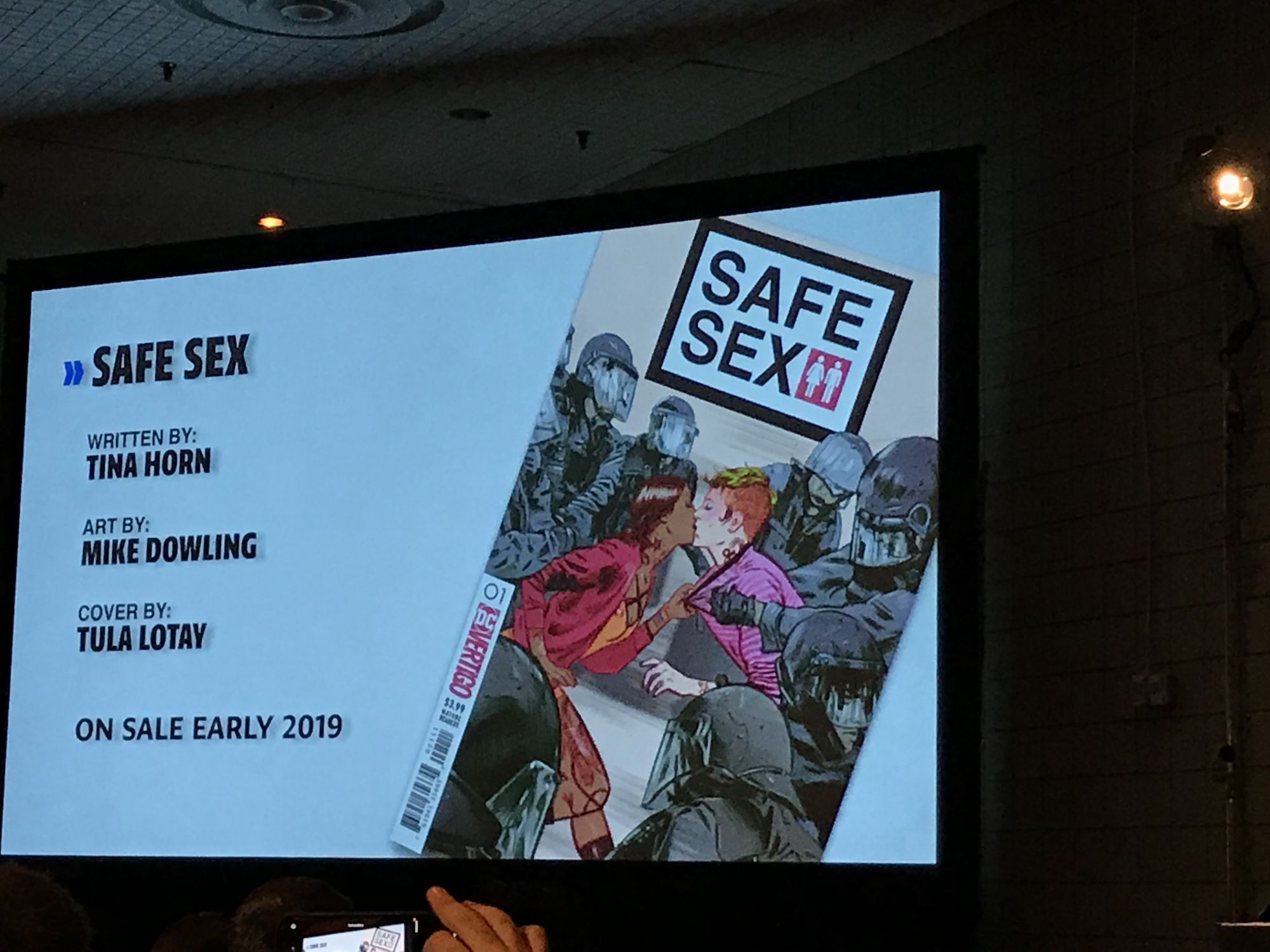 Tina Horn is a sex podcaster and activist who has joined Vertigo with her debut comic Safe Sex about a dystopian future where sex is highly regulated by the government and sex rebels called the "The Dirty Mind" must fight it. Horn thanked Vertigo for encouraging representation in these personal character driven new titles. She promises some thrills,chills and mutilation in early 2019.