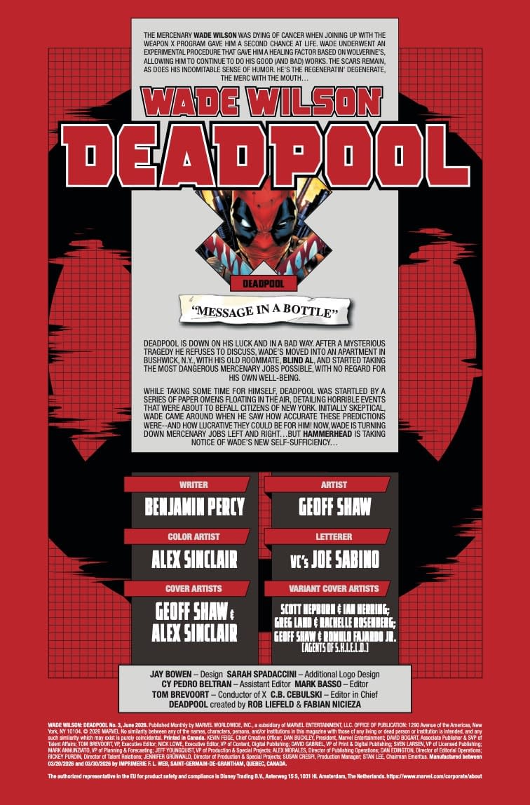 - Interior preview page from 75960621448800311 WADE WILSON: DEADPOOL #3 GEOFF SHAW COVER, by Benjamin Percy & Geoff Shaw & Geoff Shaw, in stores Wednesday, April 22, 2026 from Marvel