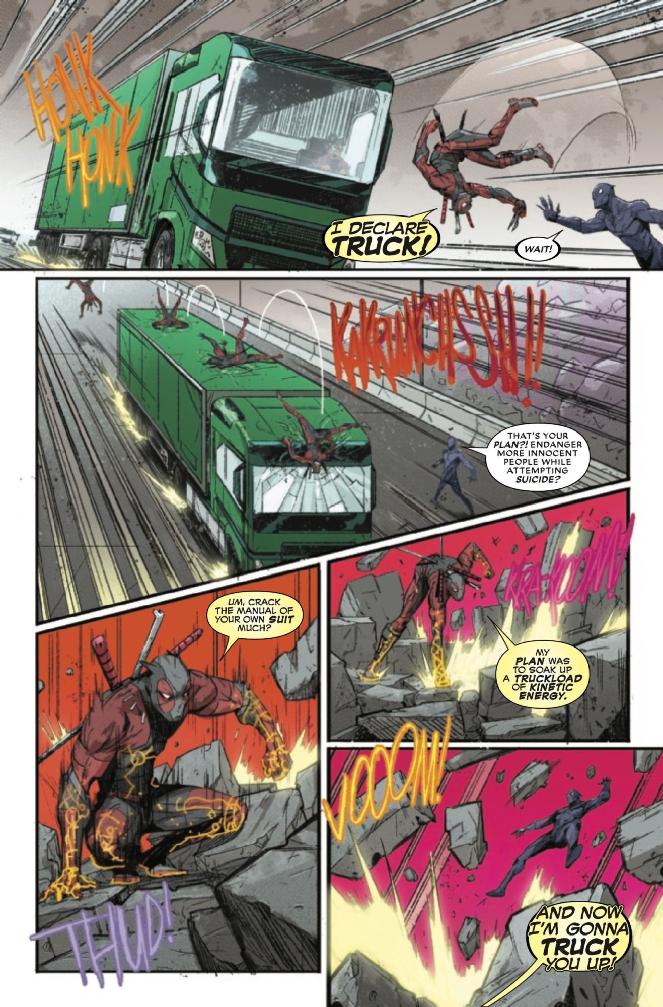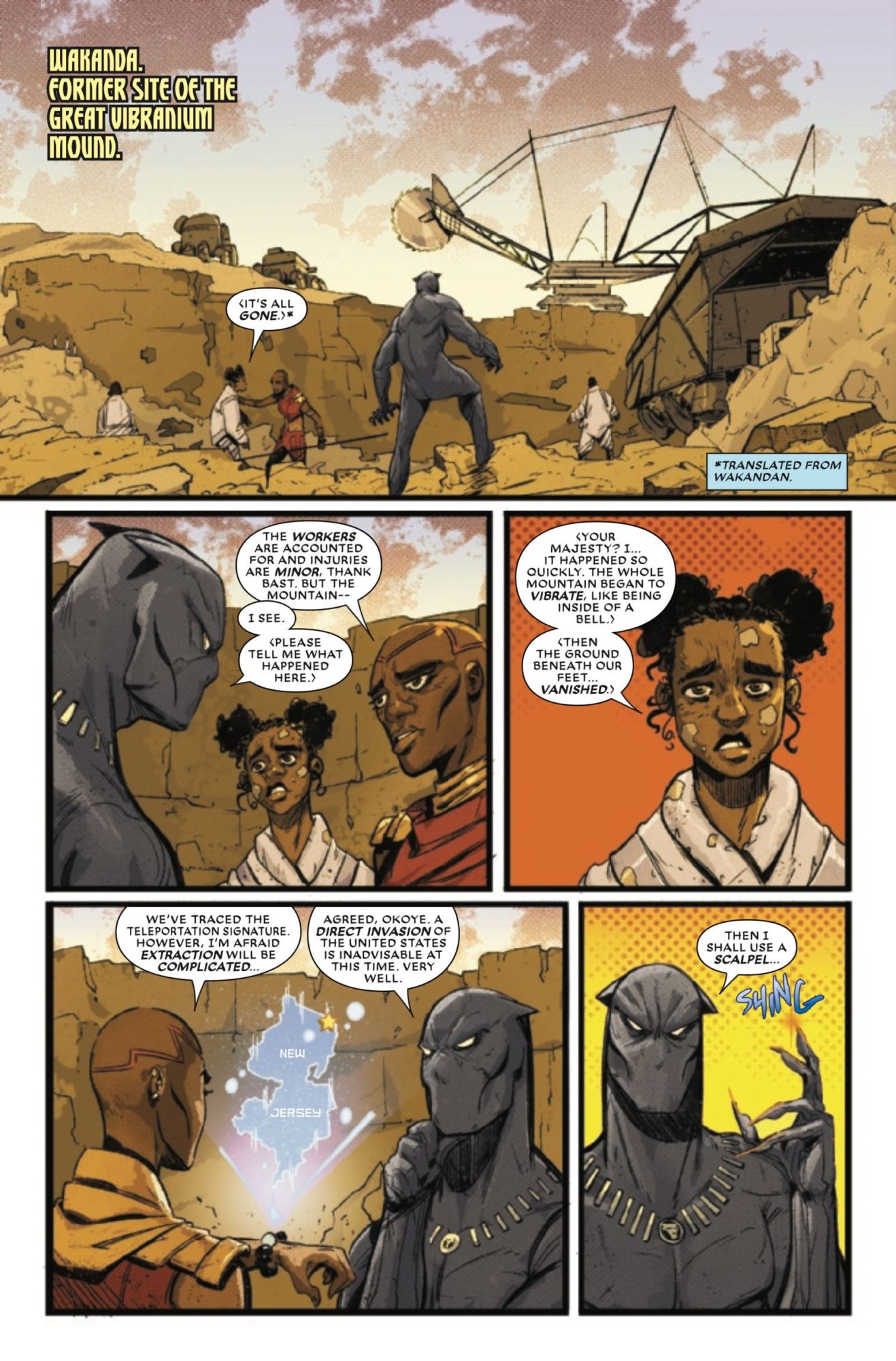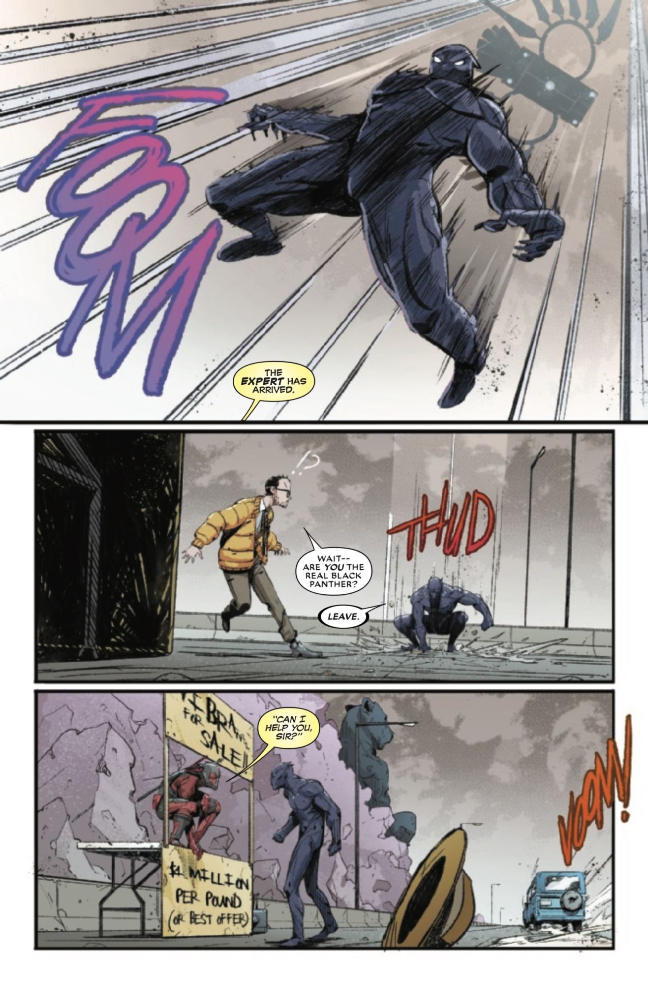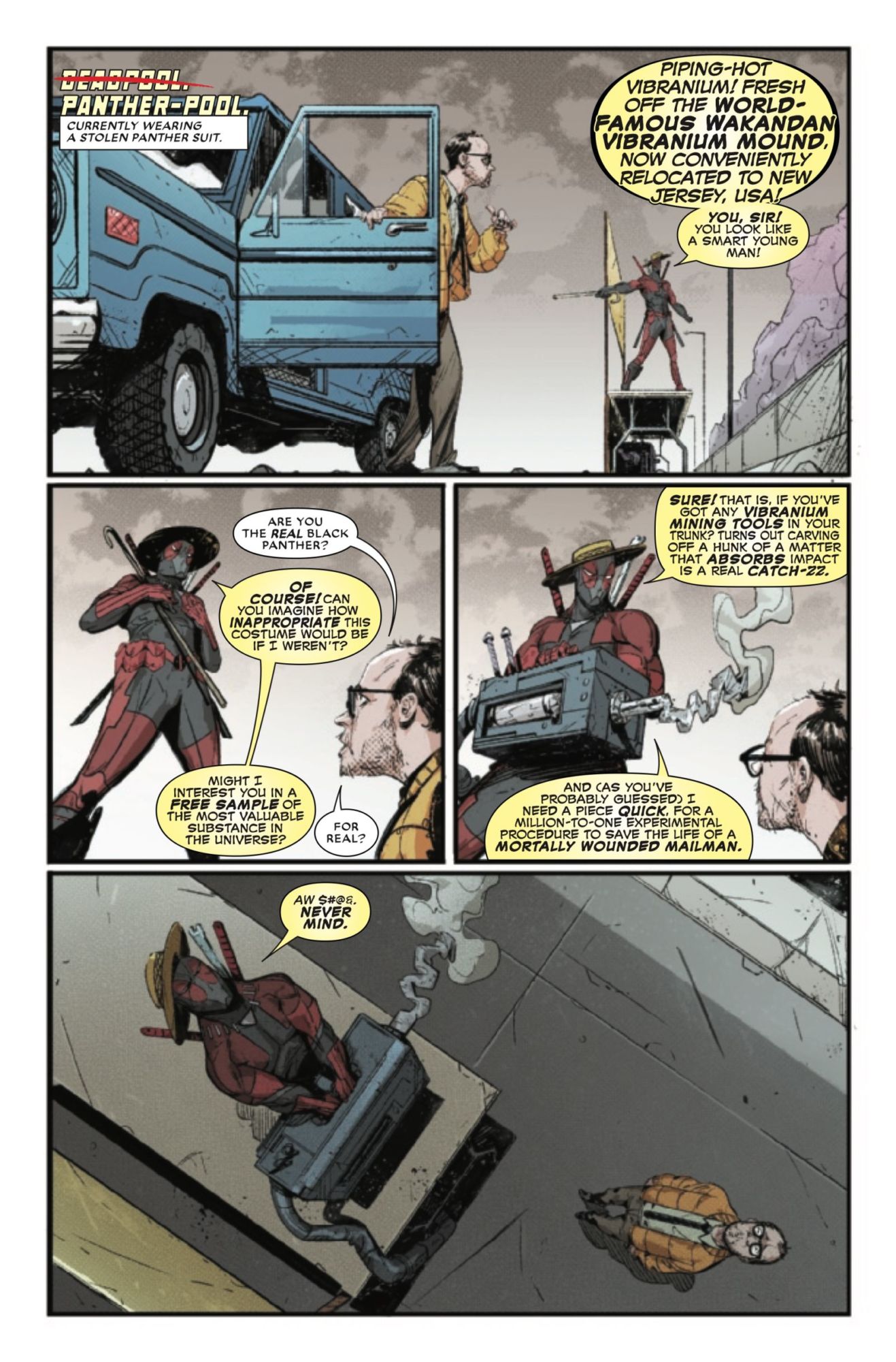 You can see it in action in this preview of the final issue of Black Panther vs. Deadpool, in which Wade Wilson has stolen the entire stock of Wakanda's vibranium (screw you, C.I.A., its still real to us) and transported it to New Jersey, all in hopes he can get a tiny piece of it to save Willy Lumpkin from certain demise.