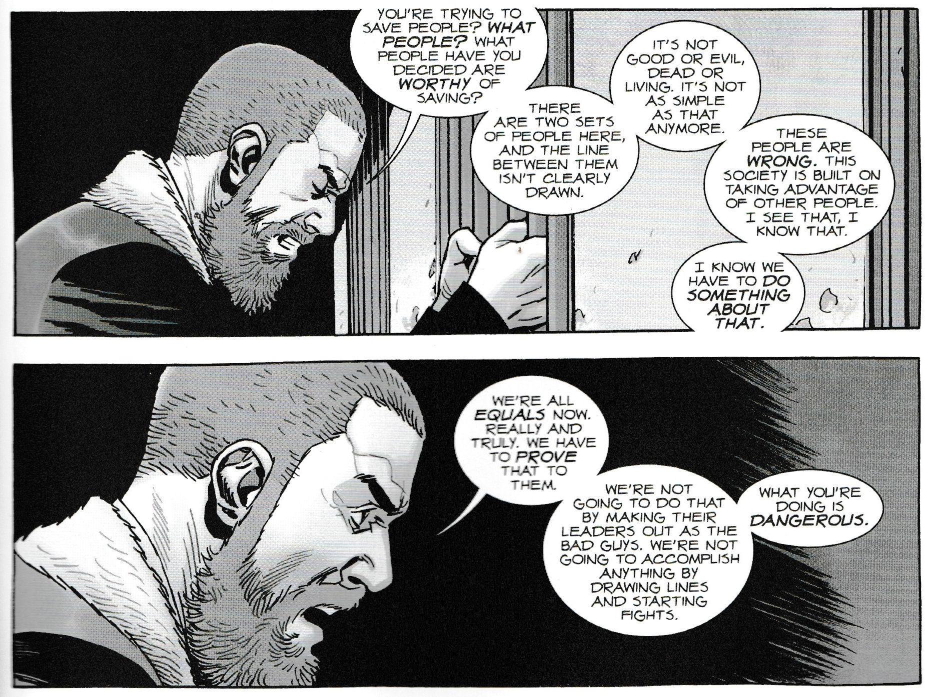 But in Walking Dead #185, Rick places his flag in the sand. He draws the line and says no more. He is not playing this game. And talks about how you oppose an idea that you disagree with, without emboldening or weaponising that idea…