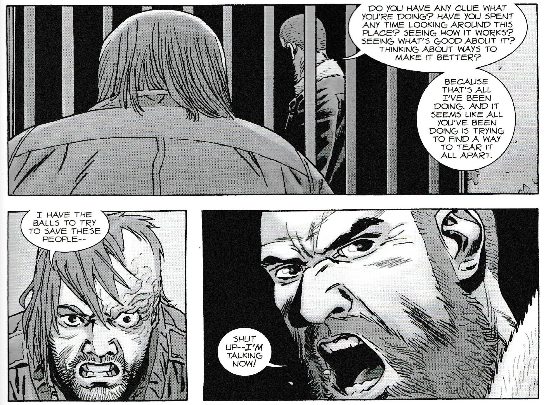 Walking Dead is famously not about the zombies. It describes the living, trying to survive in a world that has fallen apart and turned against them – and then turning on each other. Well Walking Dead #185 may be a turning point for that as well.