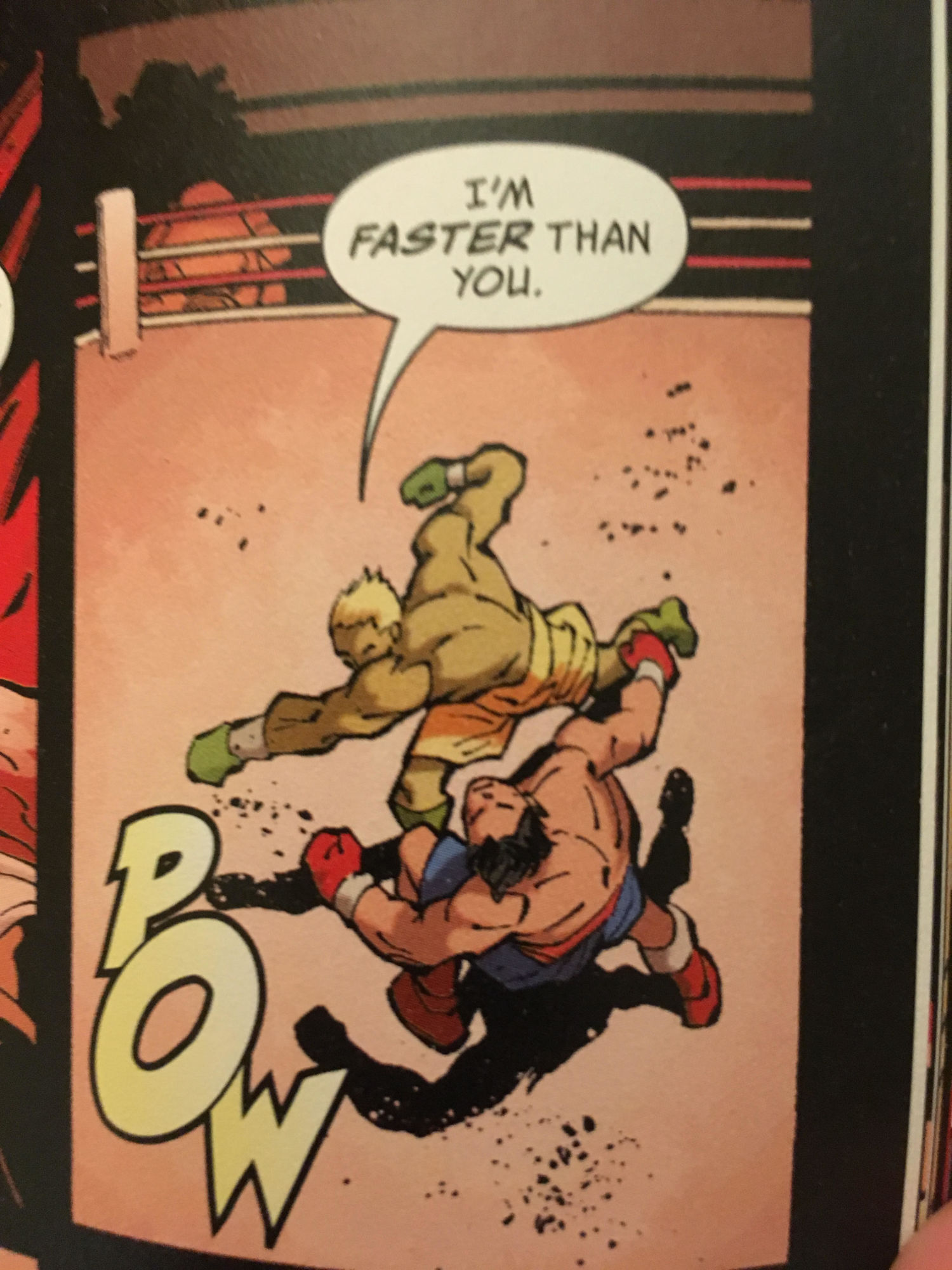 Tom King structures this short chapter around each round of the fight, ten rounds/pages' worth. Mighto, billed as "the mightiest mercenary, [and] the scourge of galaxies", uses his brute force as well as some blunt trash talk, in hopes of wearing down Superman and defeating him.