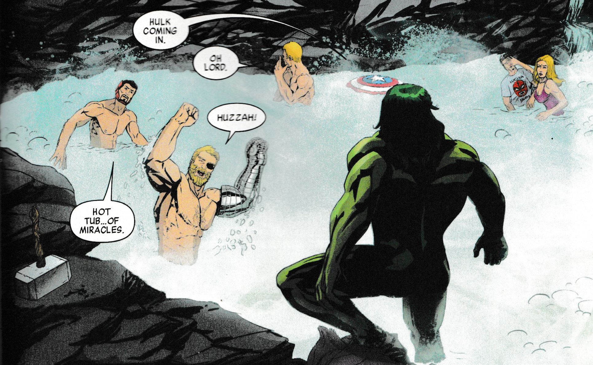 And yes, while this feels like solid slashfic with Captain America, Iron Man and Thor all naked in a hot tub, to be joined by a She Hulk who clearly needs it…