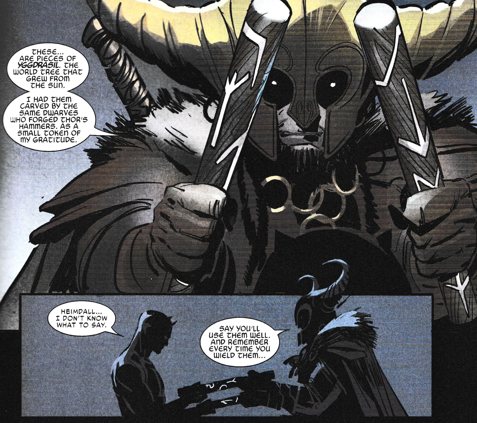 He's not alone. Omega also has Heimdall give Daredevil new weapons to carry with him now that he no longer has 'The Sight'…