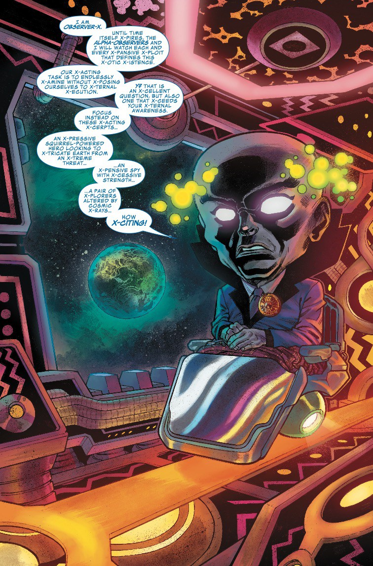 Okay, we get it. Making X-puns is basically a way of life for X-Men fans. But in a preview of next week's Infinity Warps #1, Marvel latches on to this concept perhaps a little too X-orbitantly. Seen below is Observer-X, a mashup between cosmic voyeur The Watcher and the X-Men's even more pervy mentor (let's never speak of his crush on Jean again), Professor Charles Xavier.