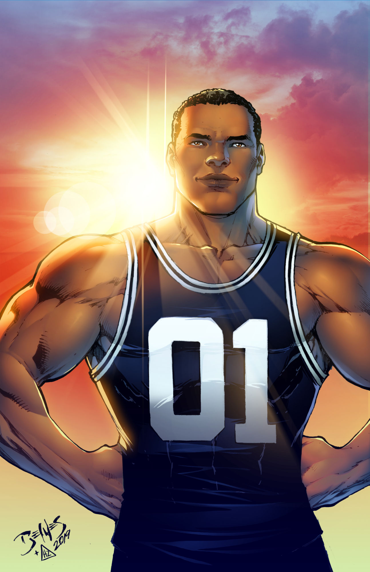 Next, I knew the series would need a great cover. Seeing the recently released Superman #1, I thought what if Versace Jackson (pronounced "Ver-sayce"), were to mimic that same Superman pose? Versace is a bodybuilder, a man of pride and integrity, and the character that opens the series with page 1. But knowing how iconic the Ivan Reis imagery is, I thought I'd need someone known for drawing icons. So the solution? Was Ed Benes.