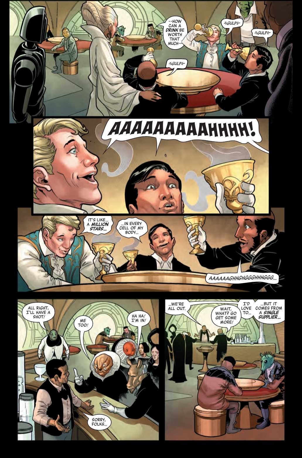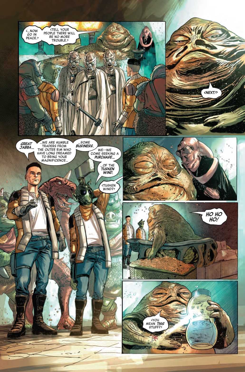 On Wednesday, Jabba the Hutt gets his own comic! Of course, it's just a one-shot, part of Marvel's Star Wars: Age of Rebellion line of comics set during the period of the original Star Wars trilogy, but it's a Jabba comic nonetheless. Unfortunately, or perhaps expectedly, it starts off a little bit gross, as we see wealthy patrons of a space-establishment enjoying an expensive new drink called Tusken Wind, one which costs 10,000 credits per cup. Though there's a good reason, as we see in this preview of Star Wars: Age of Rebellion: Jabba the Hutt #1…