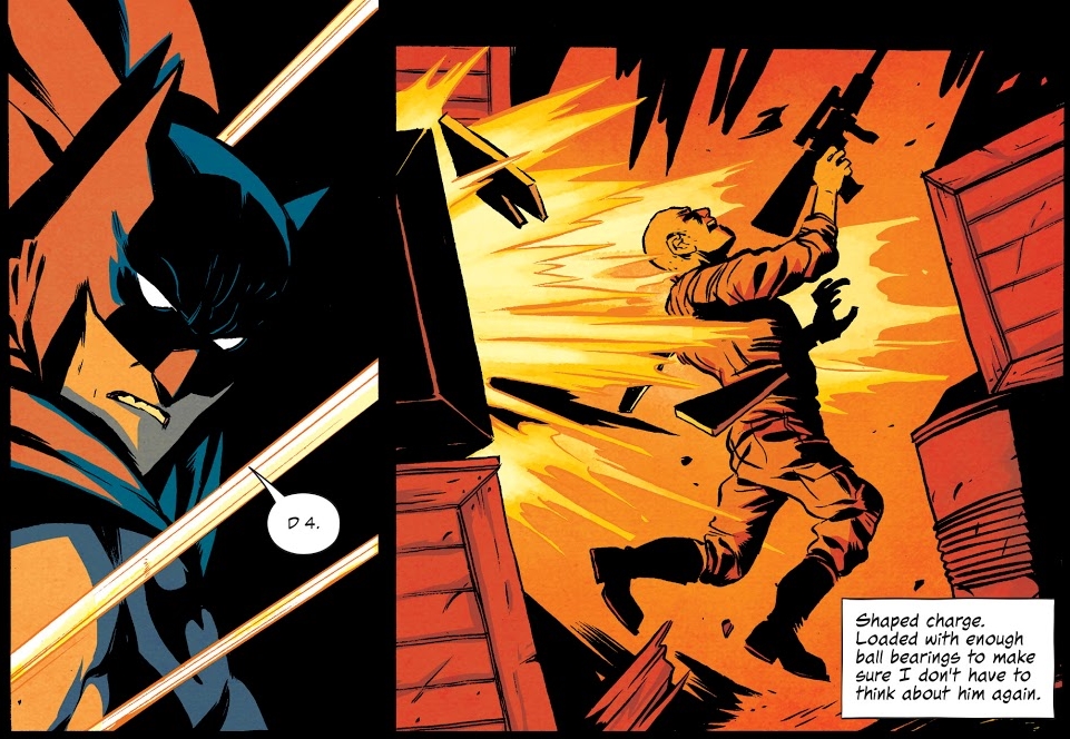Warren Ellis and Becky Cloonan give us the Batman Who Plans, creating a trap that he guides the bad guys towards, before using voice commands to turn the generic warehouse against the villains.
