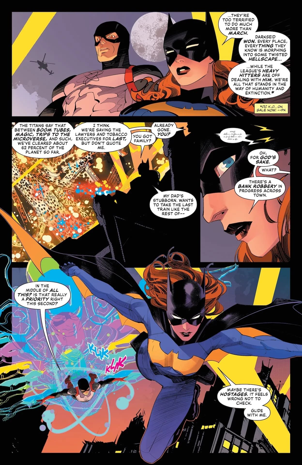 Justice League Unlimited #12 by Mark Waid and Dan Mora is published by DC Comics this Wednesday. And the preview shows Barbara Gordon as Batgirl, alongside Ray Palmer, The Atom, patrolling the streets of Gotham while the Earth is being evacuated as a result of the impending DC's K.O. battle tournament and the arrival of Darkseid. But this being Bleeding Cool, we like to go a little beyond the official preview if we can. So spoiler hats on…