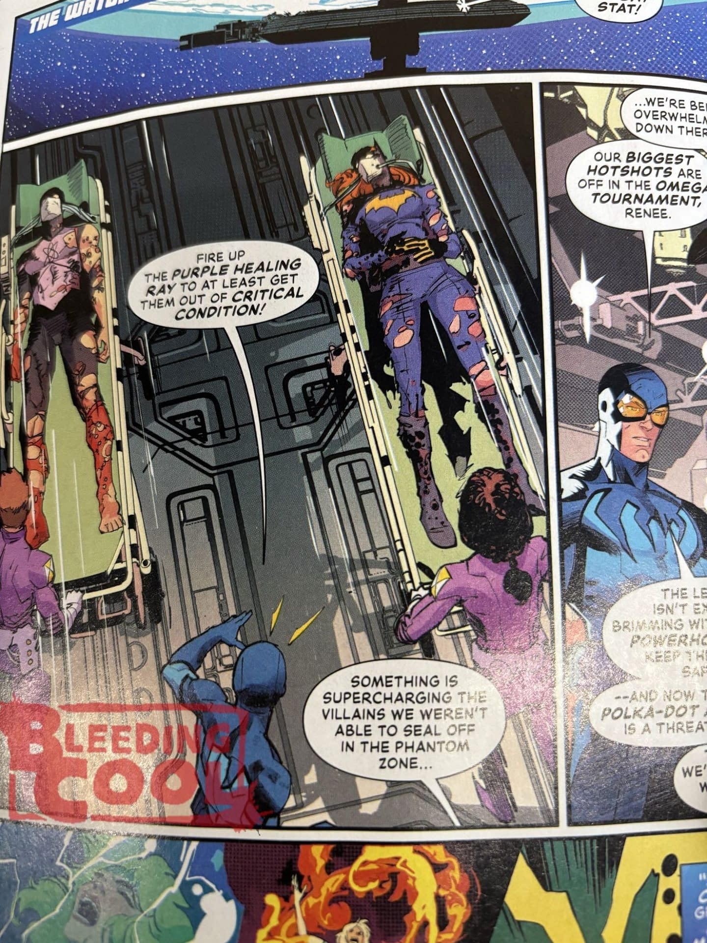 End of the preview! But maybe Bleeding Cool can sneak in one more page. What the Polka Dot Man was actually doing, I can't tell you. All I have is the following page showing Barbara Gordon and The Atom, back on the Justice League Watchtower, not in the best way…