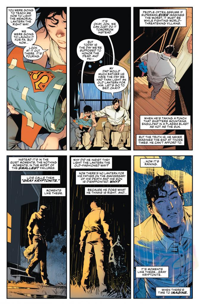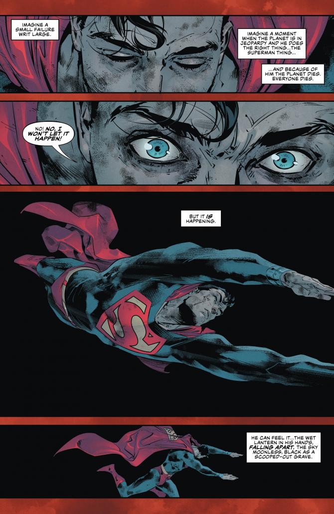 What does Superman think about? If you read the Many Deaths of Lois Lane issue of Walmart Superman, you might believe all Superman ever thinks about is Lois Lane dying in creatively gruesome ways. That's love, after all, Tom King has explained. And he was in the C.I.A. But in this preview of Justice League #24, we learn that Superman thinks about other depressing stuff too, like his dead Pa, or what it might be like if he inadvertently caused the destruction of the world.