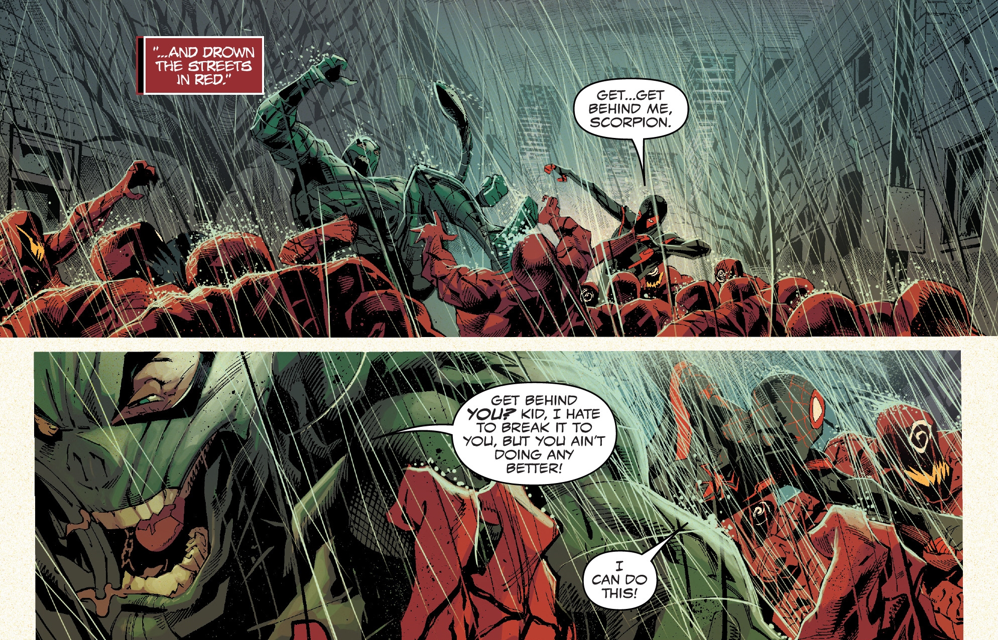 It's business as usual for Miles Morales as he finds himself squaring off with Mac Gargan, A.K.A. THE SCORPION! But as a cult of Carnage's bloodthirsty acolytes swarms New York, Miles will learn the hard way that Scorpion has a history with Venom and the other symbiotes of the Marvel Universe! If he can survive this issue, that is.