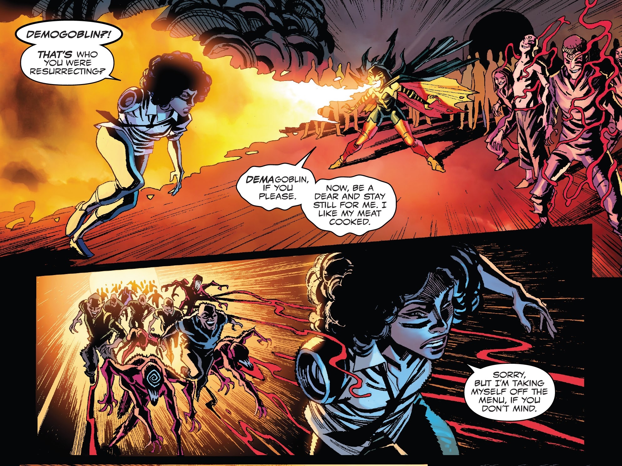 Leading to this double-splash page as Carnage surveys all he crosses over with. With scenes from previous issues of Deadpool Vs Carnage, Scream, Separation Anxiety, Lethal Protectors, and Miles Morales.