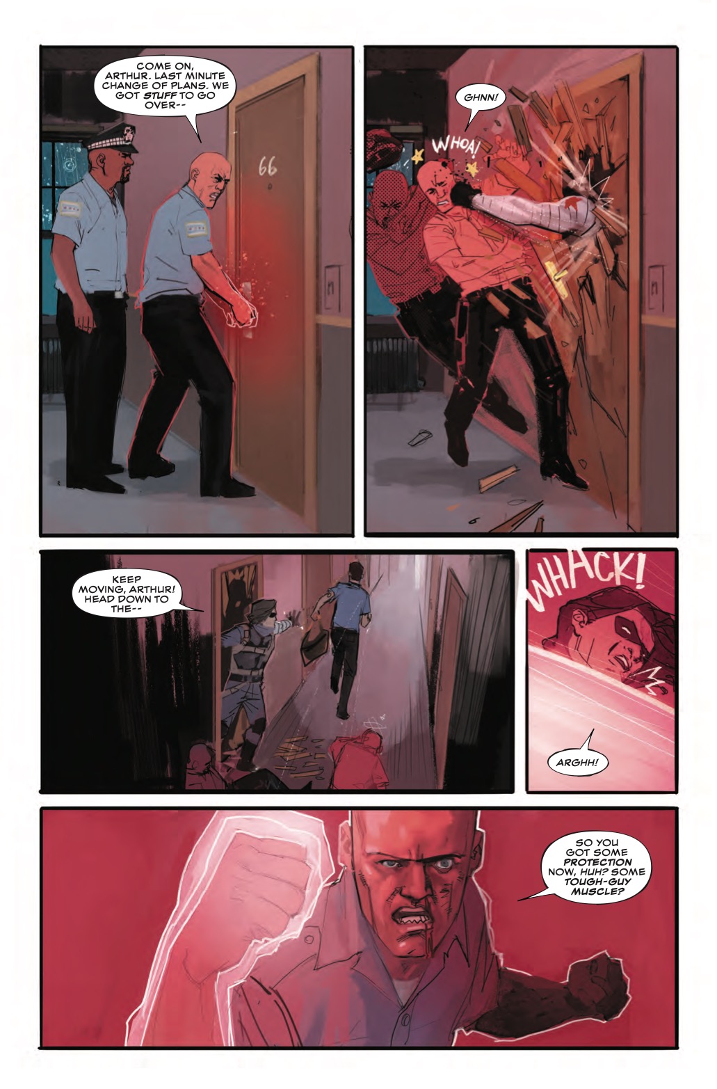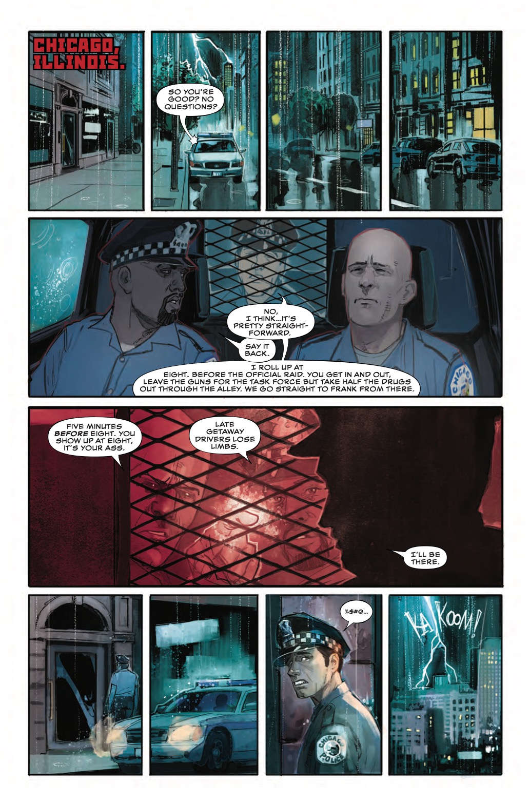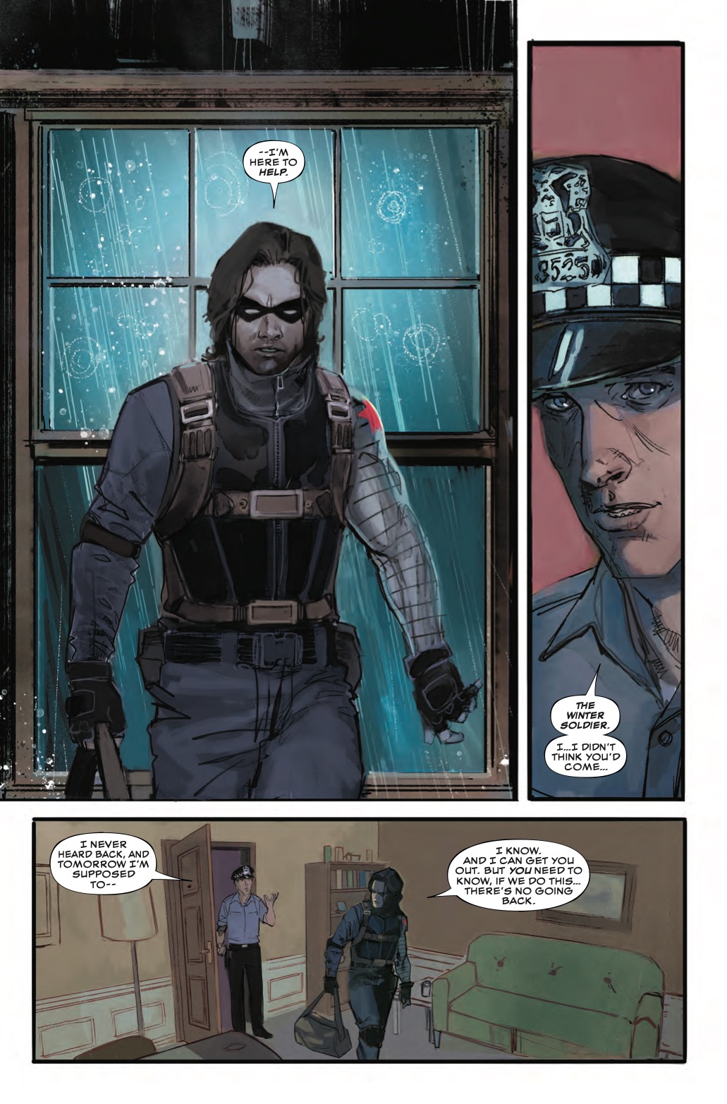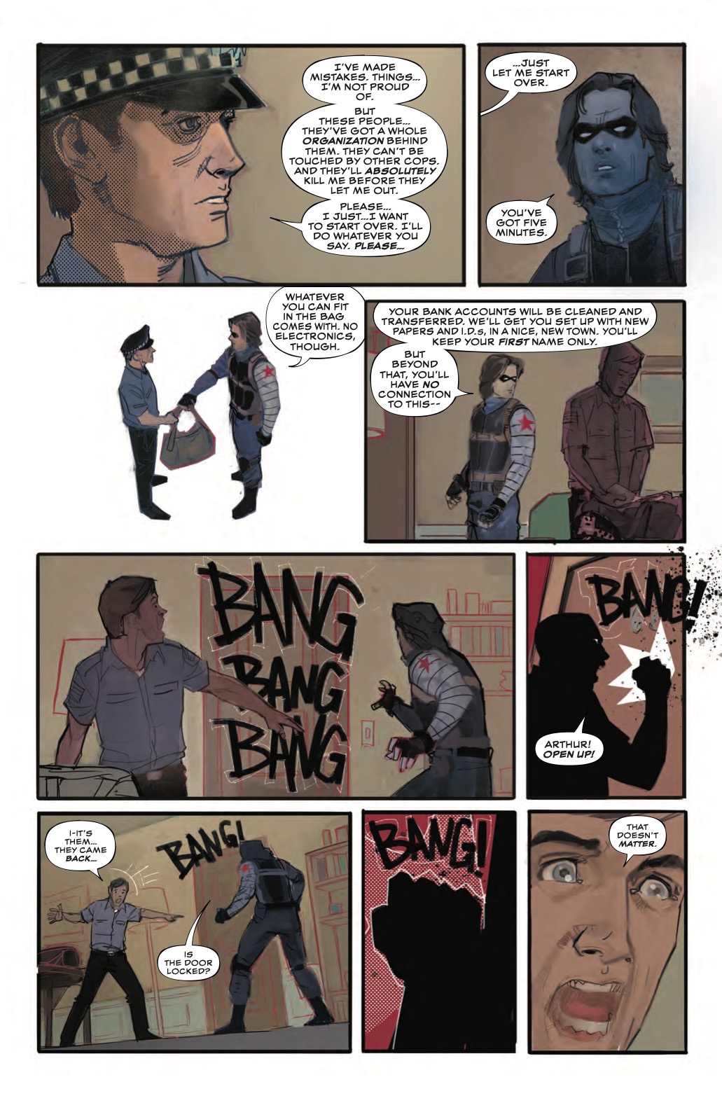 You're probably wondering how we got to this point. Well, there's actually a pretty good reason, as this preview of next week's Winter Soldier #1 reveals. It turns out those cops are dirty, and they're planning a heist of some drugs, and they're forcing a fellow officer, Arthur, to go along with it.