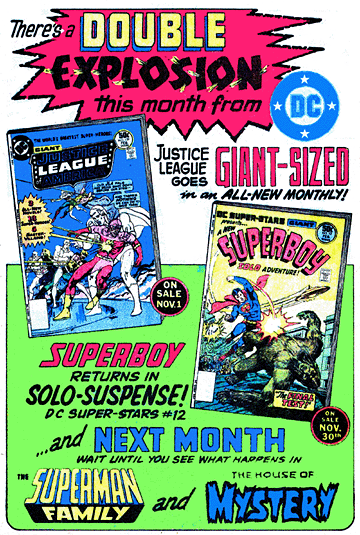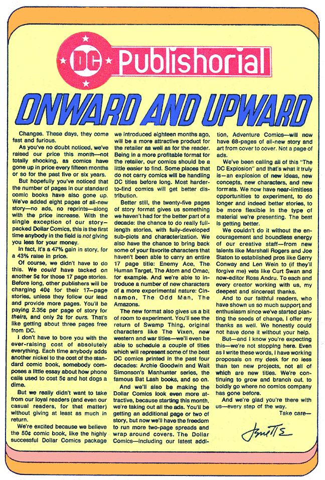 In the mid-1970s, under publisher Jenette Kahn and with Warner Communications oversight, DC Comics aggressively expanded their line. Kahn called it "an explosion of new ideas, new concepts, new characters, and new formats." The likes of Batman and Flash, would get new back-up stories starring secondary existing characters such as OMAC and Enemy Ace. Titles such as Justice League of America would now have 25 page, all-new stories which would allow "near-limitless opportunities to experiment, to do longer and indeed better stories." DC also introduced Dollar Comics, a line of books featuring 80 pages of all-new story and art for $1 such as Superman Family, House of Mystery, World's Finest and G.I. Combat. With 16 new titles in 1975, 21 in 1976, 12 in 1977, and 8 in 1978, 57 new titles in four years including Firestorm, Black Lightning, Shade The Changing Man, and Steel, and relaunched of Jack Kirby's New Gods and Mister Miracle.All aiming to capture more market share amid competition from Marvel. Rozakis benefited personally, writing backups like those in Secret Society of Super-Villains and even scripting early stories for what might have become a Joker's Daughter feature (a conceptual precursor to Harley Quinn). The "Explosion" launched prominently in mid-1978, but the timing couldn't have been worse.