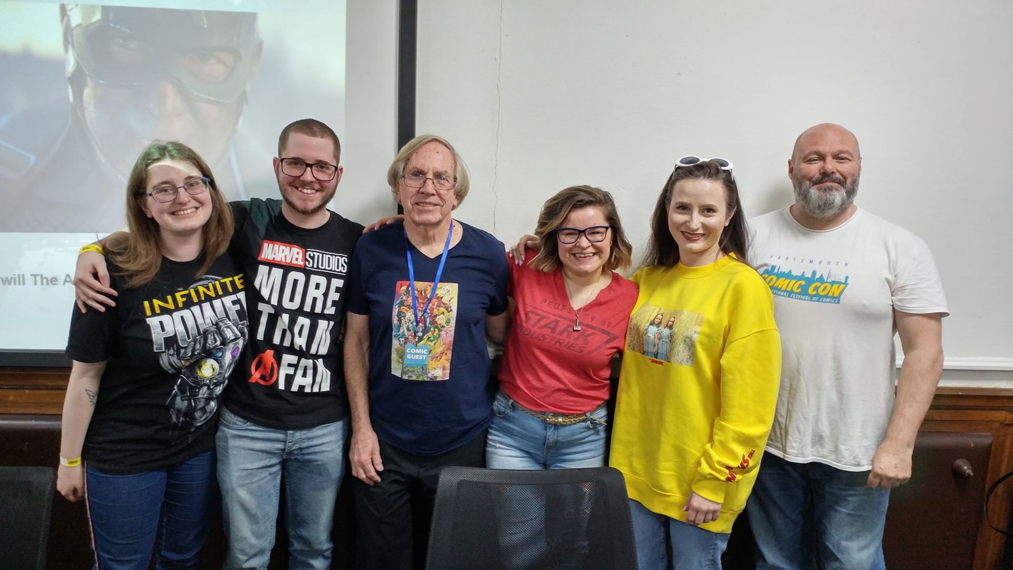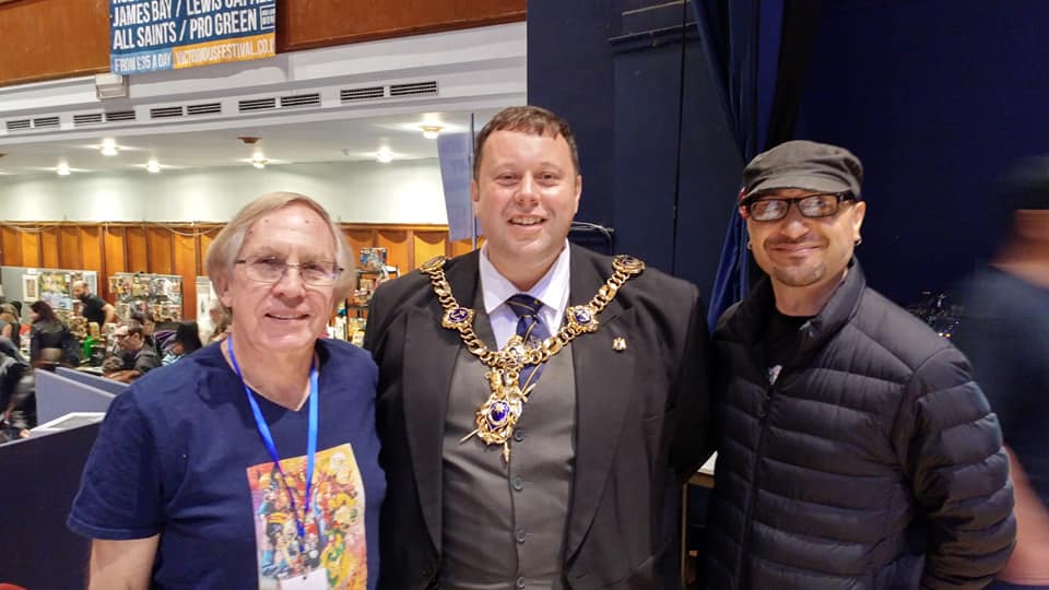 The next day, the Lord Mayor of Portsmouth Lee Mason came out to pose for a few pictures with us , then I was talking with a young man who was going to host a panel in which four local college students talked about "Avengers: Endgame," and I opined that it might be fun to be on that panel, so he shoehorned me in. I learned a lot about the film that I had missed thus far from the quartet of bright 20-ish students, three young women and one young man. I disagreed with a couple of their perspectives and tried to say so politely, but I certainly learned more than I "taught," which is always good. One student didn't think there should be any more Marvel movies starring "white male heroes." I disagreed with that, but stressed that at the same time I'm happy to see ethnic and gender divergency in the characters… I'm just not always wild about retconning racial or ethnic traits onto a character who didn't originally have them, and feel that it's much better to make up new characters, as witness what's been done recently with Spider-Man. At least they didn't wind up stoning me. John Cimino, in the audience, got embroiled in the discussion more than usual, too… he generally stays in the background, which is odd considering his background as a punk rocker a decade or so back, but on this occasion the enthusiasm of the students drew him in, too, and I think the sizable audience enjoyed the exchanges. I learned, for example, the answer to my burning question (SPOILER ALERT, if there's anyone out there who hasn't seen the movie yet!) of how Steve Rogers managed, near movie's end, to go back in time and live a civilian, happily married life for decades without erasing what Captain America had done in the same timeline since thawing out of the ice. Hint: It has to do with the number of Power Stones.