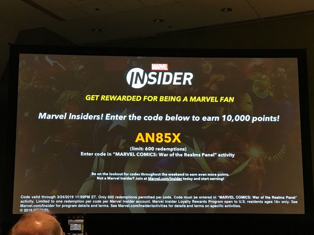 And because you've all been good boys and girls, and everyone in the room has had a chance to get theirs, the Marvel Insider Code from the War Of The Realms panel worth 10,000 reward points…