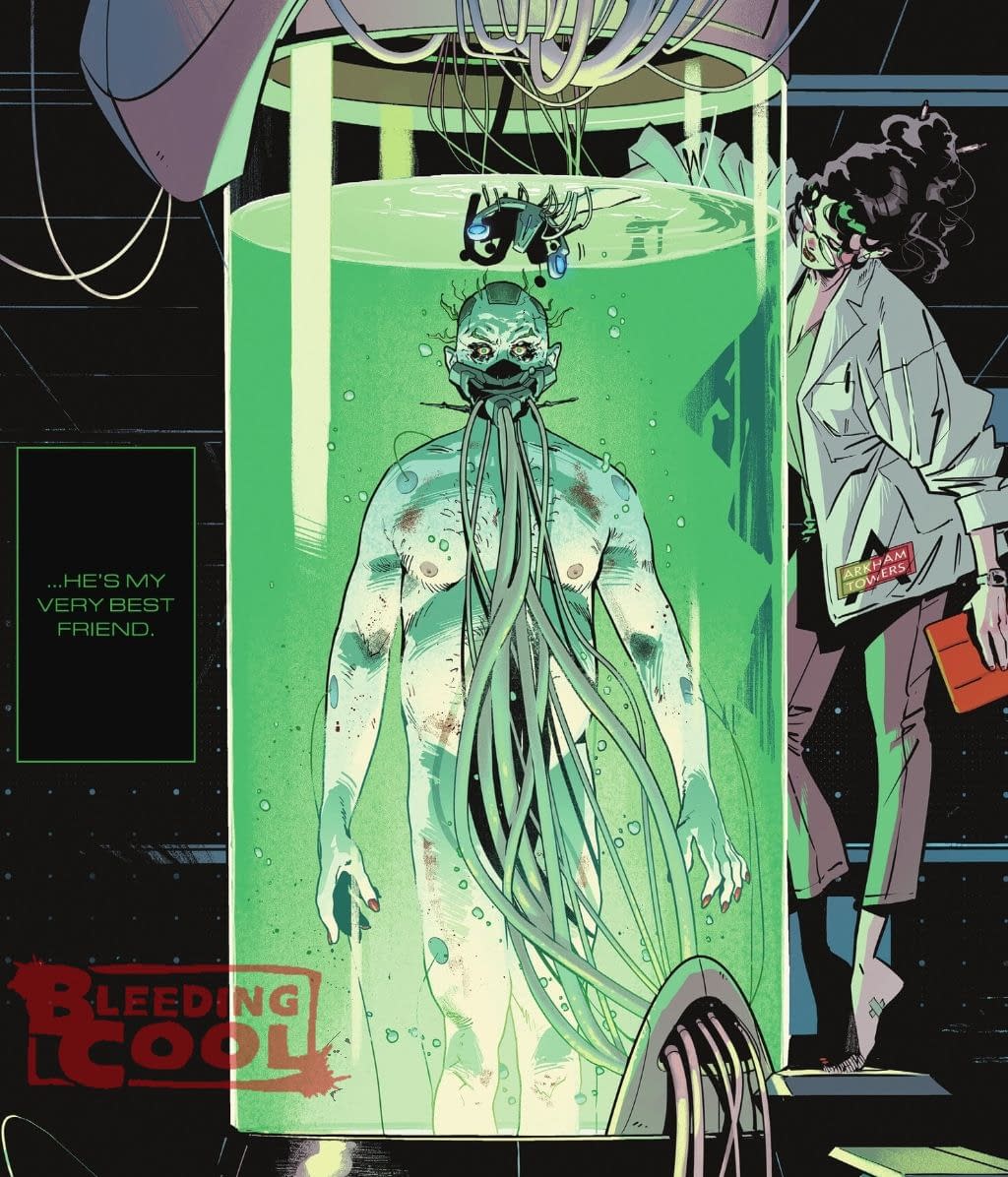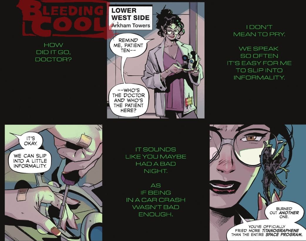 The Joker is currently fighting alongside Superman, Wonder Woman and Lex Luthor in DC's K.O., including the Boss Battle, and it looks like he will return to Batman later this month in Batman #7. Which, of course, might also mean an unannounced appearance in today's Batman #6 by Matt Fraction and Jorge Jimenez. To recap, Arkham Tower psychiatrist/psychologist Dr Zeller has been on a date with Bruce Wayne. She especially got his attention by talking about a certain invention of hers.