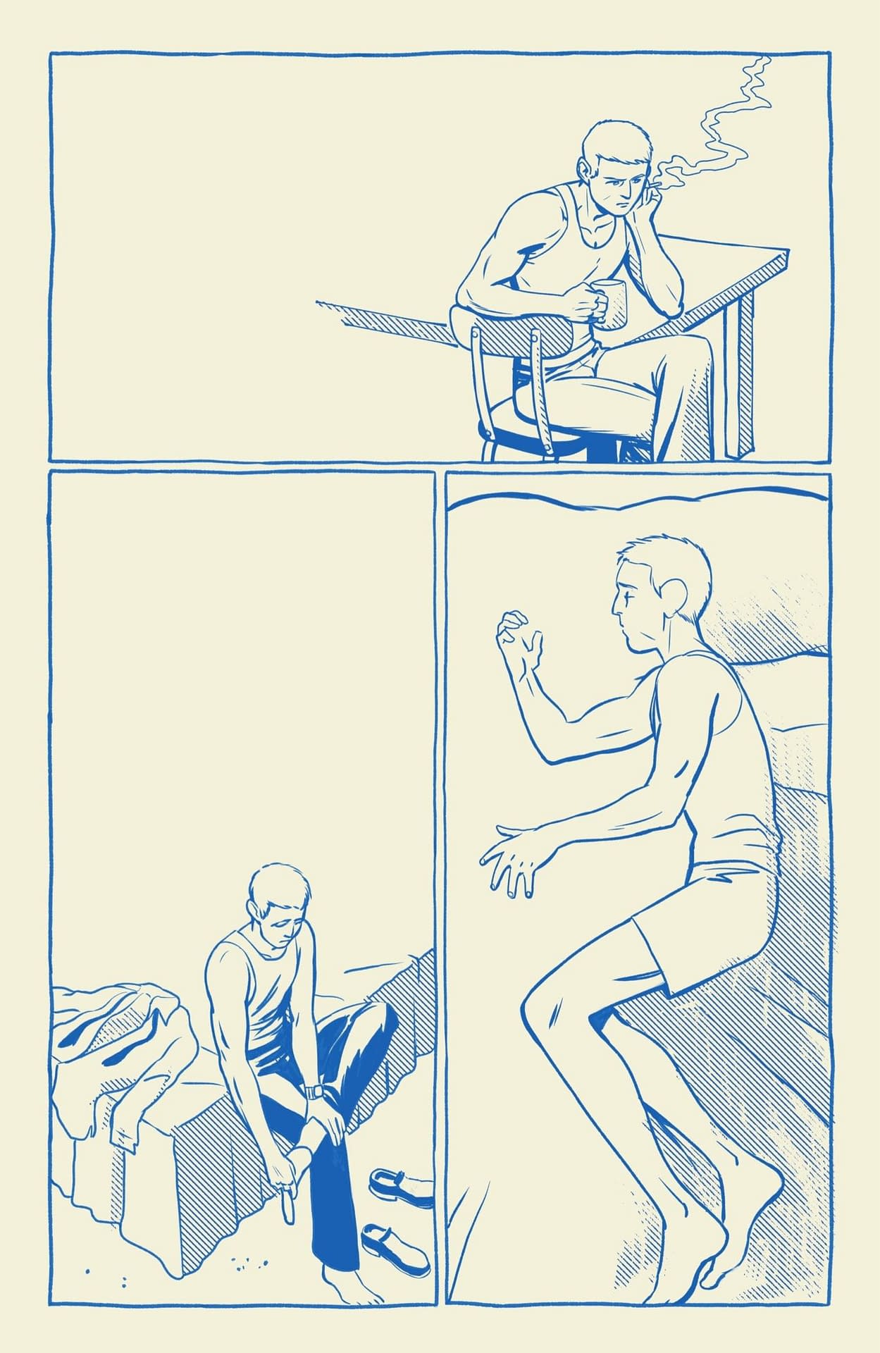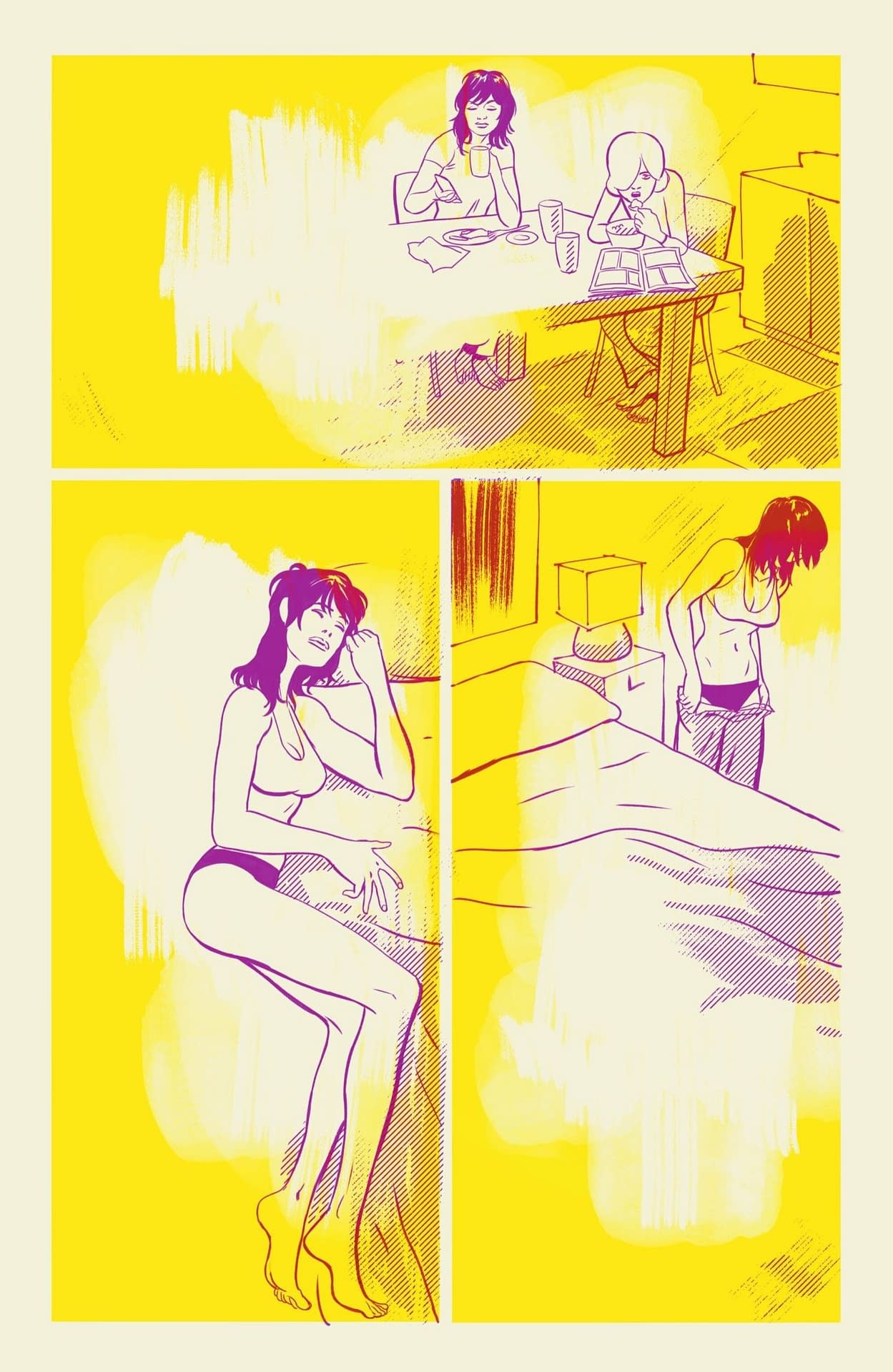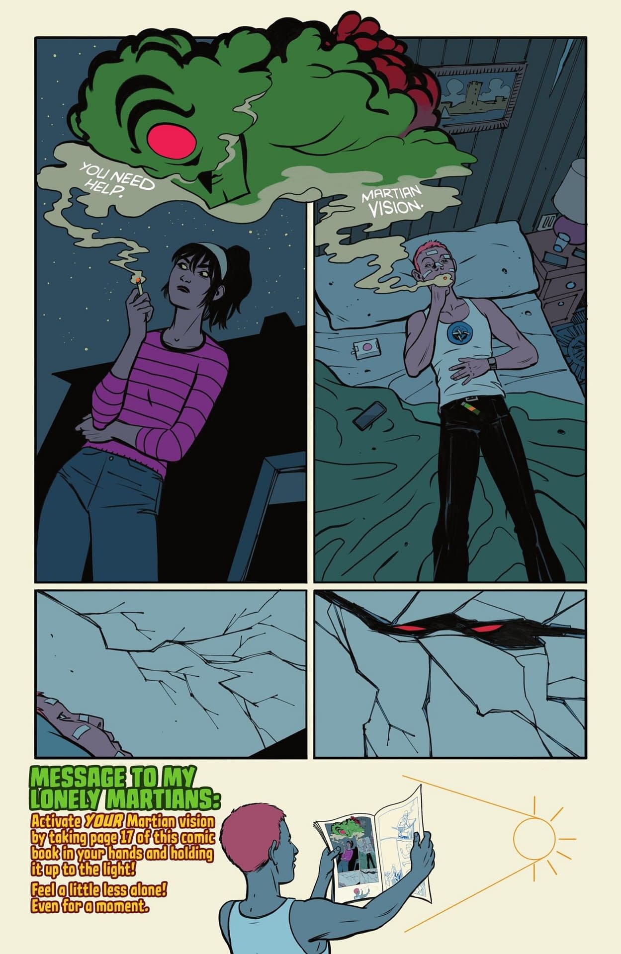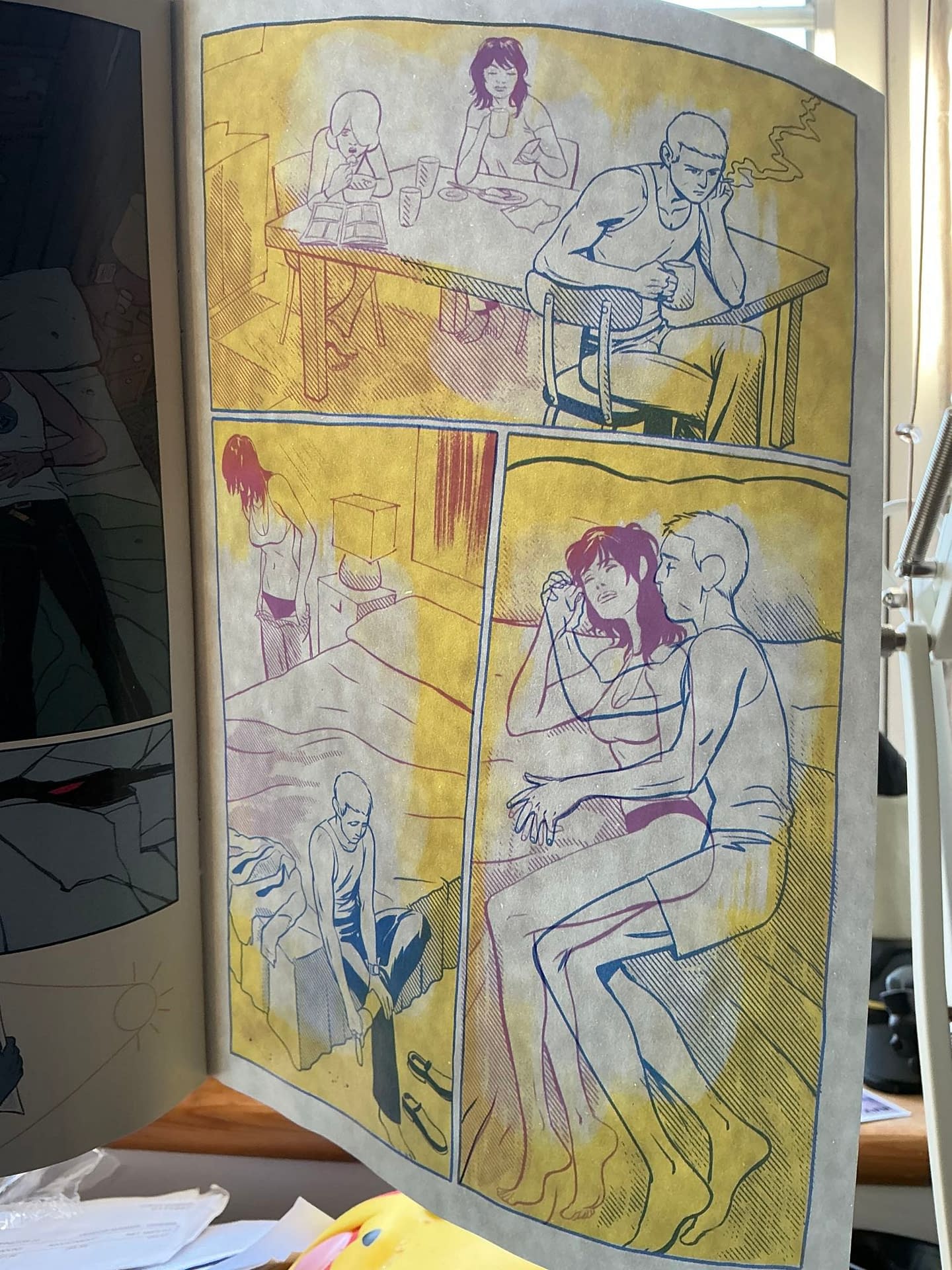 I then wandered through to Soho to Gosh Comics to buy some Christmas comic books, including the new Absolute Martian Manhunter, which, as promised, does the see-through page trick again. However, this time, instead of showing visions, other realities poking through from one mental state to another, it uses the trick to join together people separated by space, but clearly thinking about each other and feeling their absence. Here's how it looks up against the light.