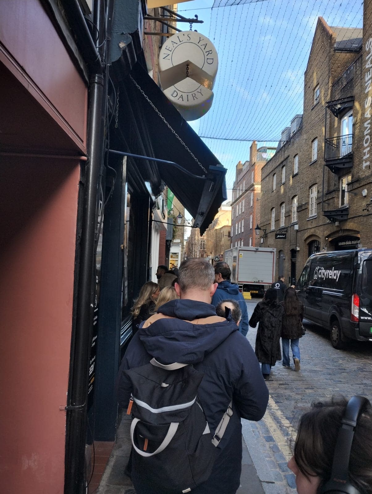 Yesterday I went shopping for cheese on Christmas Eve, from Neal's Yard Dairy, in London's Covent Garden. It is my favourite cheese shop in the world, and so naturally I took a photo of the line, and my place in it.