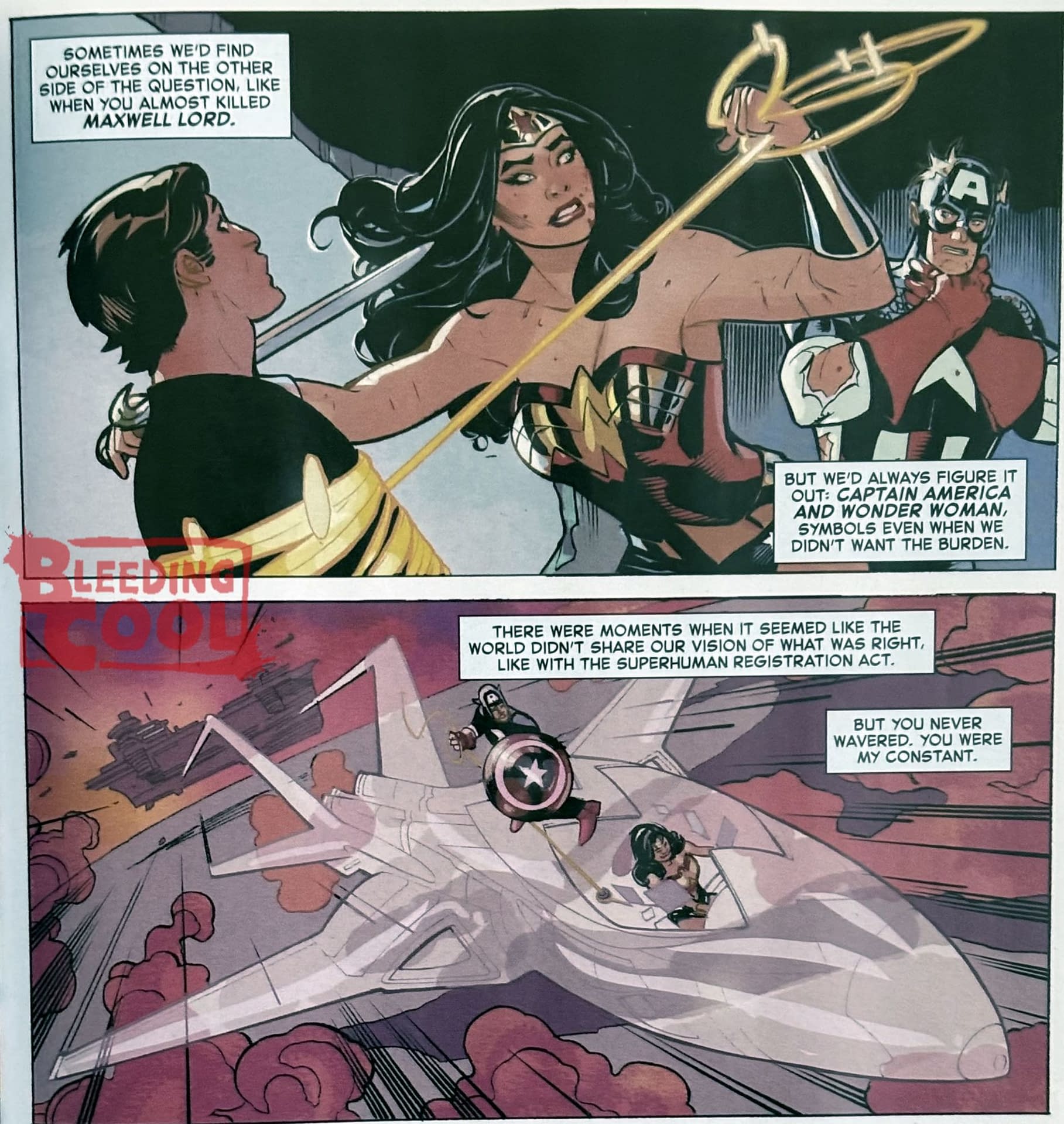 Looks like Wonder Woman was making her stand with Captain America alongside the NRA of superpowers, saying "no, you move" in her Invisible Plane. And Maxwell Lord got to keep his head. More, much more to come… and we have one of those handy dandy Deadpool Batman tags to collate all the Bleeding Cool coverage, spoilers and analysis of this twice-in-a-generation comic book, published by Marvel Comics with DC Comics this Wednesday, the 17th of September.