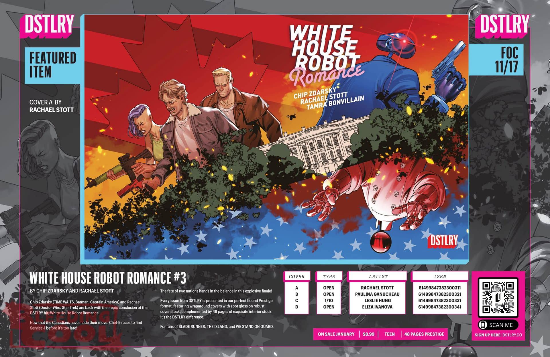 Chip Zdarsky (TIME WAITS, Batman, Captain America) and Rachael Stott (Doctor Who, Star Trek) are back with their epic conclusion of the DSTLRY hit, White House Robot Romance! Now that the Canadians have made their move, Chef-9 races to find Service-1 before it's too late! The fate of two nations hangs in the balance in this explosive finale! Every issue from DSTLRY is presented in our perfect bound Prestige format, featuring wraparound covers with spot gloss on robust cover stock, complemented by 48 pages of exquisite interior stock. It's the DSTLRY difference. For fans of BLADE RUNNER, THE ISLAND, and WE STAND ON GUARD.