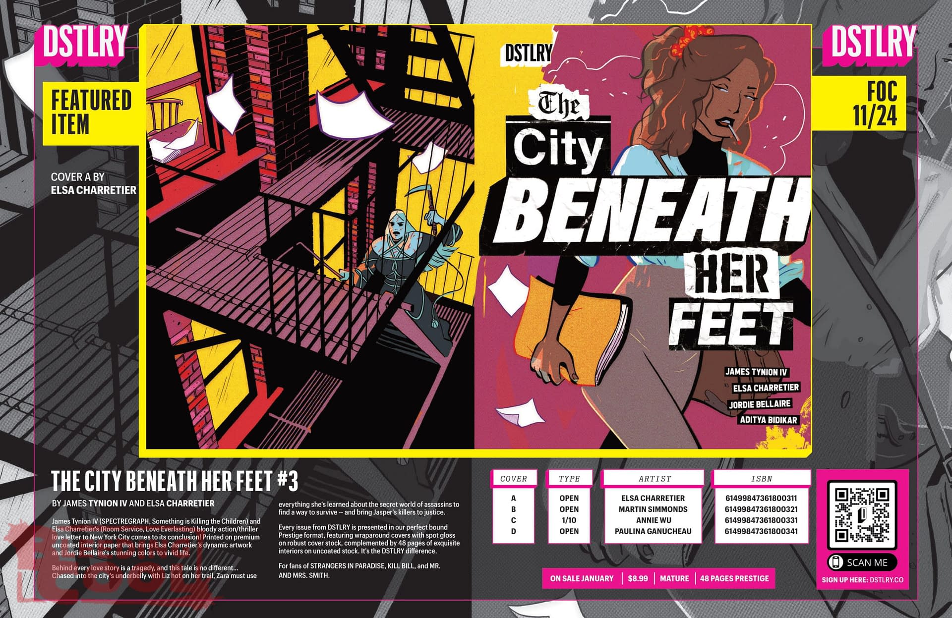 James Tynion IV (SPECTREGRAPH, Something is Killing the Children) and Elsa Charretier's (Room Service, Love Everlasting) bloody action/thriller love letter to New York City comes to its conclusion! Printed on premium uncoated interior paper that brings Elsa Charretier's dynamic artwork and Jordie Bellaire's stunning colors to vivid life. Behind every love story is a tragedy, and this tale is no different… Chased into the city's underbelly with Liz hot on her trail, Zara must use everything she's learned about the secret world of assassins to find a way to survive — and bring Jasper's killers to justice. Every issue from DSTLRY is presented in our perfect bound Prestige format, featuring wraparound covers with spot gloss on robust cover stock, complemented by 48 pages of exquisite interiors on uncoated stock. It's the DSTLRY difference. For fans of STRANGERS IN PARADISE, KILL BILL, and MR. AND MRS. SMITH.