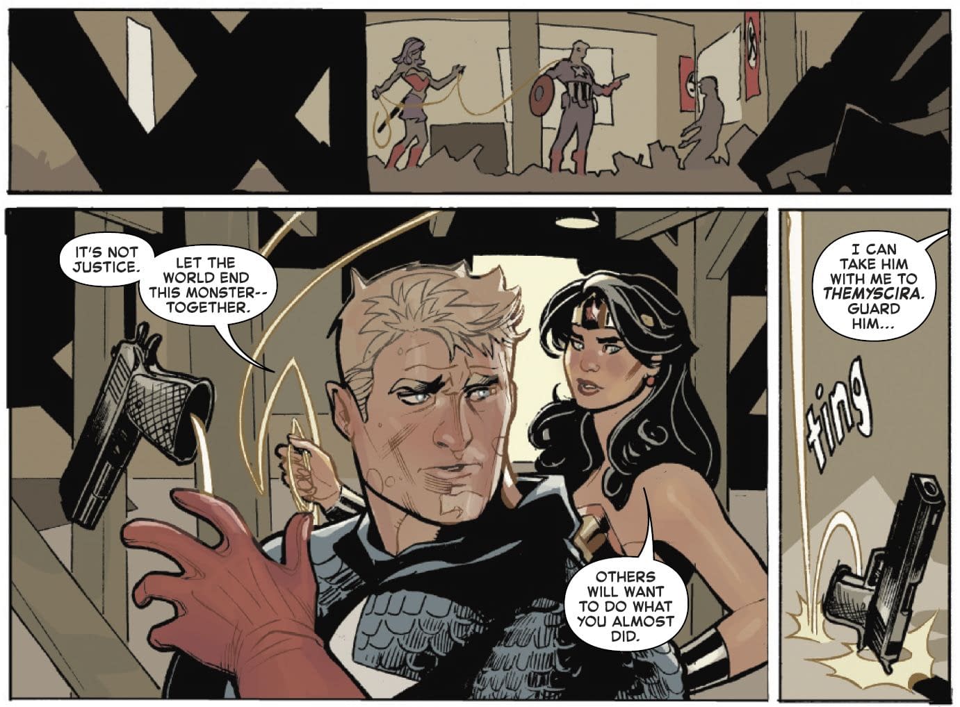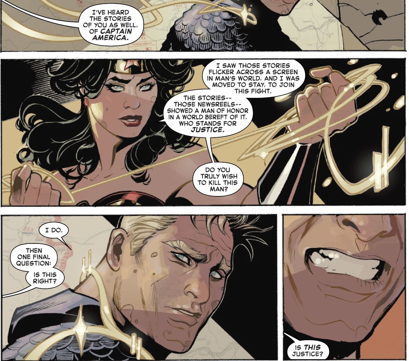 The comic book sees Captain America and Wonder Woman fighting in World War II, in Berlin, towards the very end of the war. And Wonder Woman persuading Captain America not to pull the trigger. Which is a choice. And it also rewrites future DC stories, with Captain America persuading her away from decapitating Maxwell Lord as well.