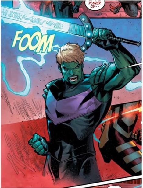 It was enough to recall this teaser from the upcoming Incoming from Marvel out next week. Which we interpreted as Hulking, a superhero of both Kree and Skrull heritage, holding a sword aloft and looking a bit like Conan.