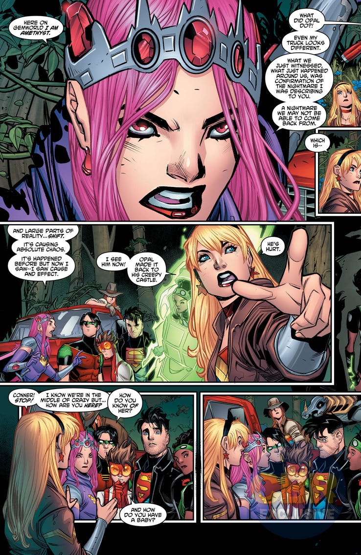 It seemed like things were finally starting to go Young Justice's way last issue, with the team free of prison in Gemworld and ready to confront Lord Opal, when Opal's reality-breaking powers manifested. Now, as we see in this preview of Young Justice #6, from "The Great One" Brian Bendis, Elena Casagrande, and John Timms, everything is different. Even Ginny Hex's truck!