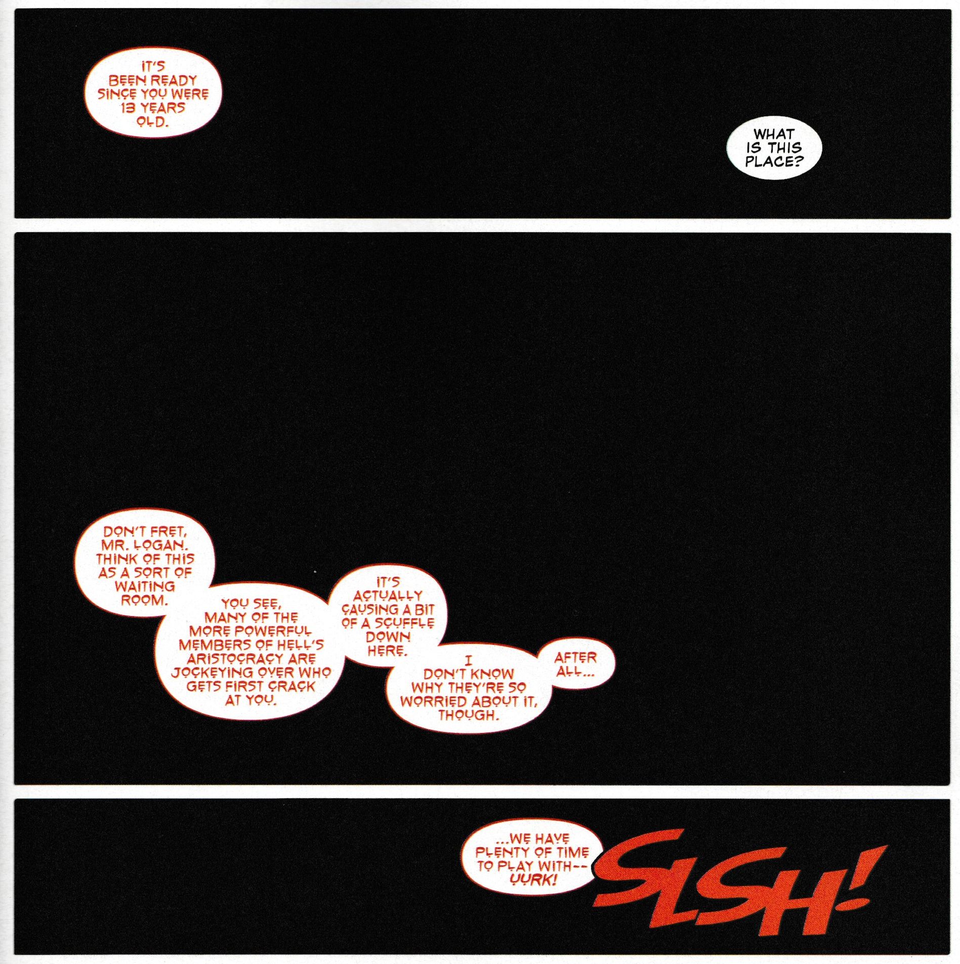 In today's Marvel Comics Presents #8, an aged wiry hirsute Wolverine decides to stop all this, waiting every ten years to fight a demon from hell with his daughter Rien, and go direct to the source. Cut out the middle portal. And to take a trip below. And it seems they have been waiting for him.