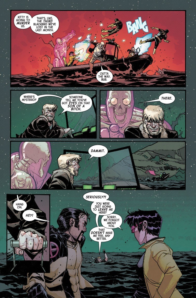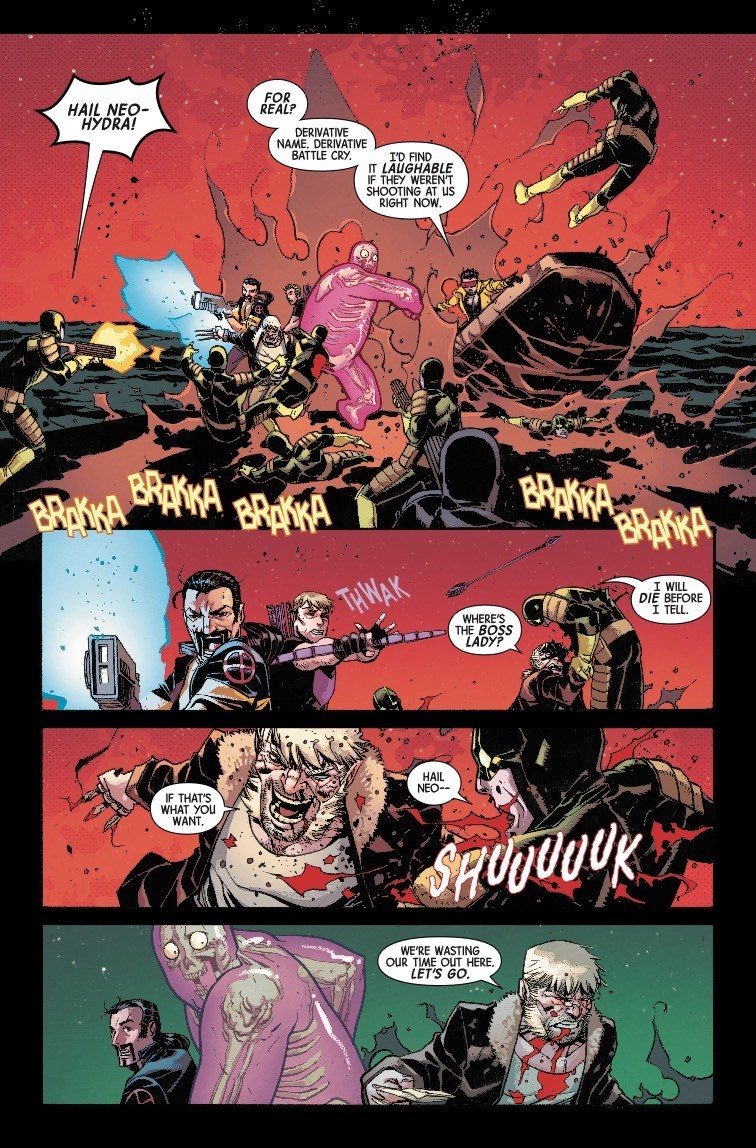 In a preview of next week's Dead Man Logan #5, Wolverine and his pals from the X-Men, alongside the recently defected villain Mysterio, are on their way to invade the secret base of Neo-Hydra, a revival of the Nazi spinoff organization formerly headed by Captain America and now run by Syn, the daughter of the Red Skull.