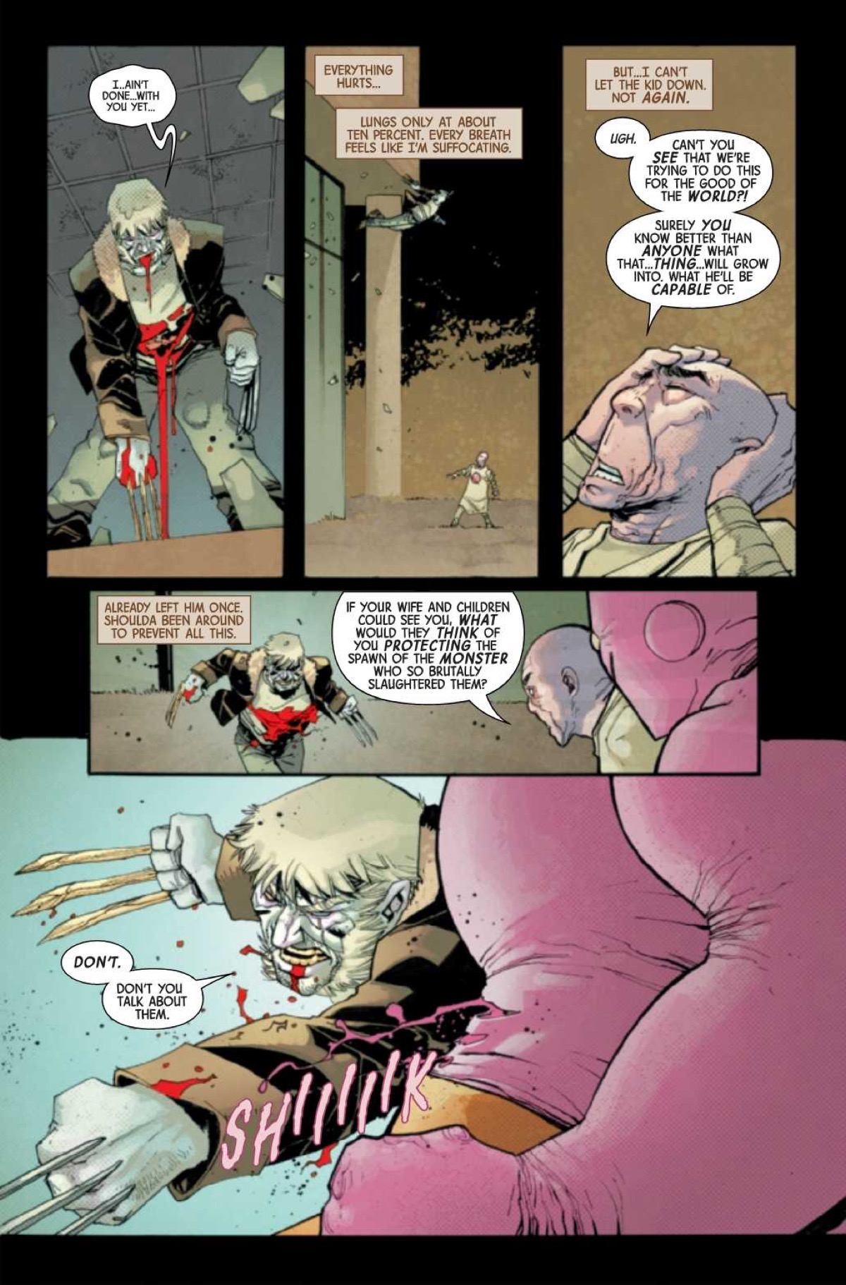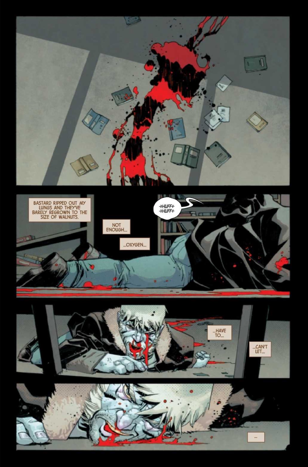 For a guy with a defective healing factor, with little time left to live, and starring in a book called Dead Man Logan, you'd think that Wolverine would operate with at least a little bit of caution. Nevertheless, Wolverine isnt' a cautious kind of mutant, which is why he went and got his lungs ripped out by the Hulk Killer last issue, and why he's relegated to crawling along the floor, literally blue in the face, in this preview of Dead Man Logan #9.