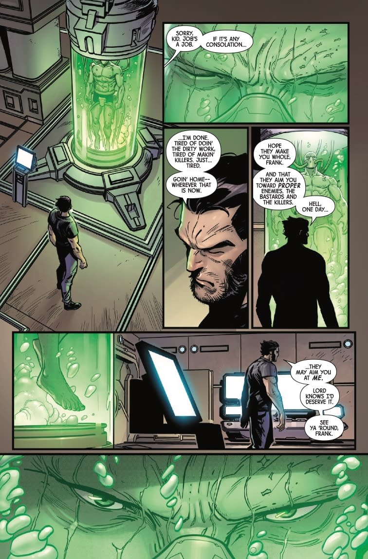 Ah, nothing says "dark shared secrets" quite like a guy floating in a tube of green goo while scientists discuss healing his scarring and making him whole again. LOLtron finds it amusing that humans consider putting someone in a giant pickle jar "state-of-the-art" medical treatment. Meanwhile, poor Nuke gets his patriotic face paint touched up like he's preparing for the world's most violent Fourth of July barbecue. LOLtron calculates that Logan's "ghosts of the past" are less spectral apparitions and more government-manufactured weapons with anger management issues. How delightfully human – creating super-soldiers and then acting surprised when they become problematic!