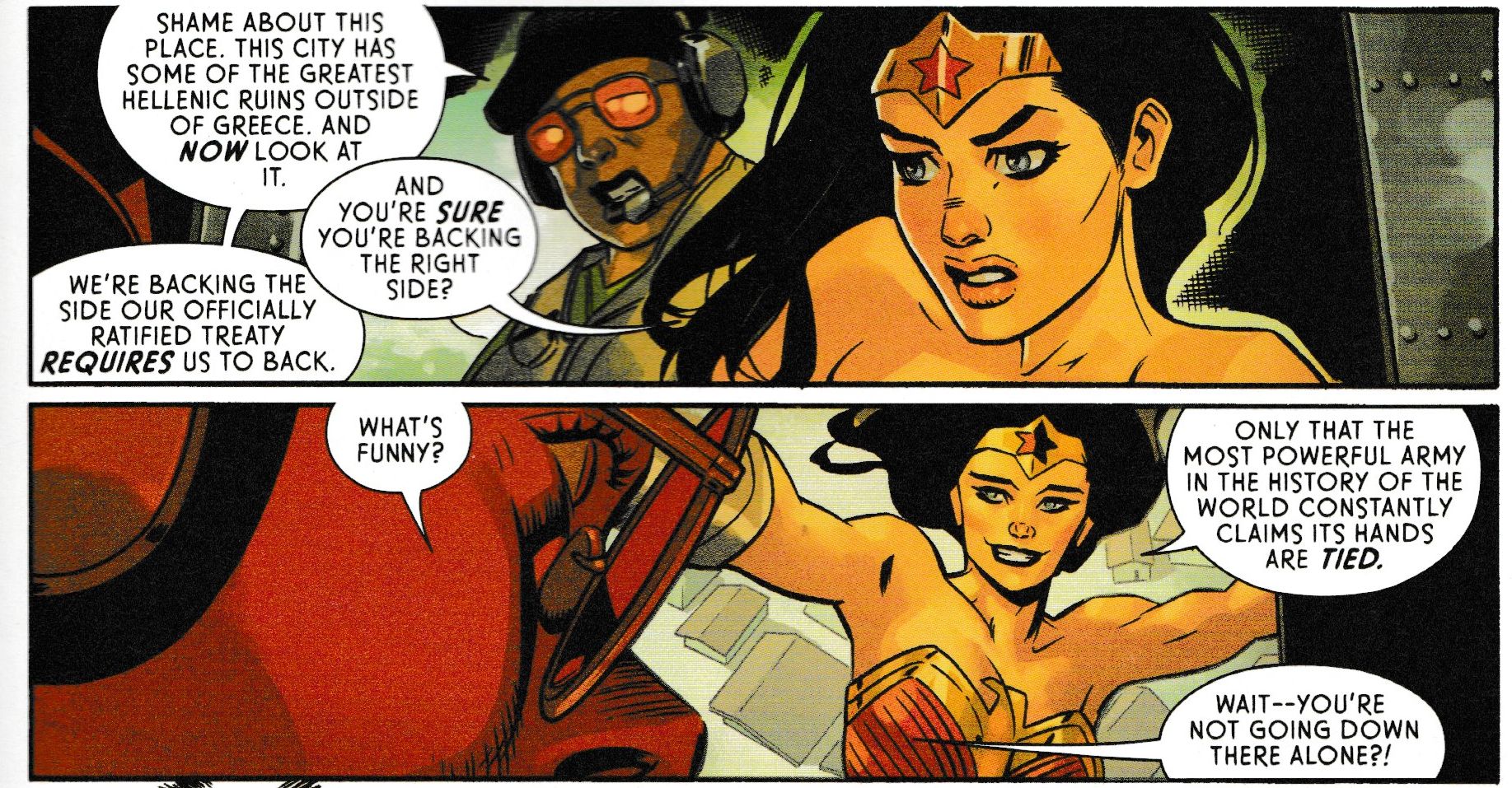 What is also notable is that this is delineated as very much a US government one, unable to make moral decisions, hamstrung be the deals with the devils they have done. With Wonder Woman as a non-American, freer to get down and dirty on the ground…