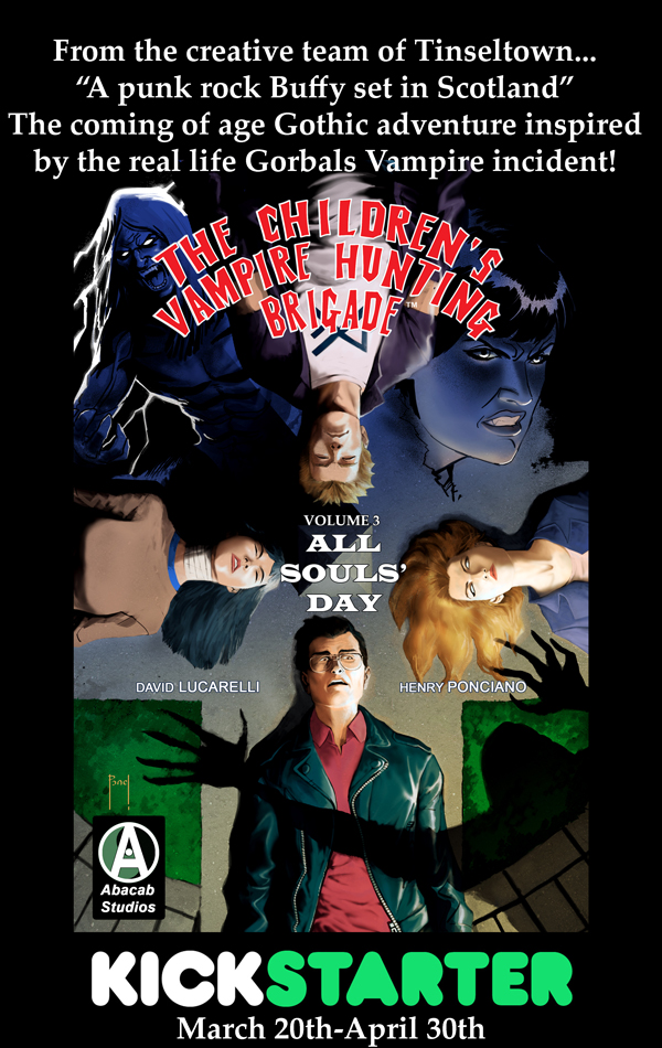 I just launched a Kickstarter for my new graphic novel The Children's Vampire Hunting Brigade: All Souls' Day, the latest stand alone story arc in my "punk rock Buffy set in Scotland," coming of age Gothic adventure series inspired by the real life Gorbals Vampire Incident. And even though I've successfully funded and delivered on two Kickstarters before, and we're off to a decent start, there are no guarantees this one will make it!