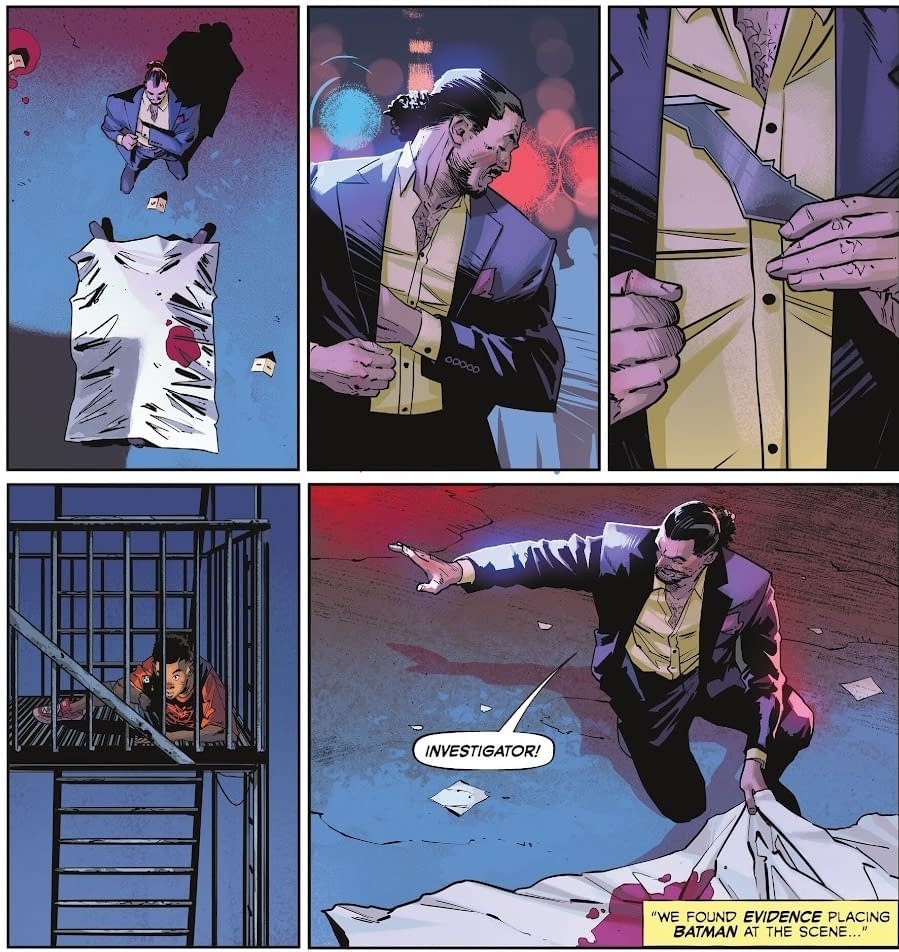 And it looks like his plans may be going up in flames. I am told to expect a story split into three, across the pages, jumping from one to the other, following narrative and visual parallels of framing and content. The kind of thing Watchmen did a lot, but not a tool that has been much used since, following each character's journey through the entire issue, with Batman and the Batfamily in the background, but very present, interacting with the three figures in one way or another.