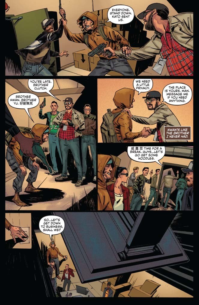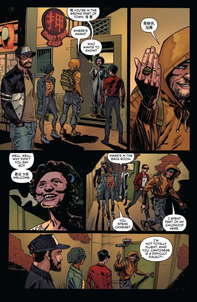 So welcome to Hong Kong, Kowloon to be exact. German really outdid himself this time with this splash page! Props to Brittanny Pelizzo the colorist and badass jiu jitsu practitioner for taking care of the complicated signage on this page. This is an important page because we cover a lot of territory here, including providing some explanation of the convoluted Kato family tree.