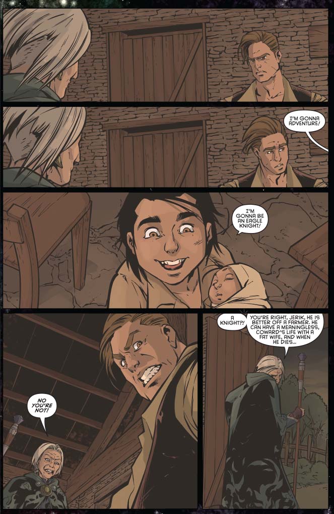 I do love how Morgan Hickman handled the colors on these pages. They're faded and dreamy, but not so faded it looks artificial. Combined with the black, starry borders and there are plenty of little touches that say "flashback" without me having to label it "once upon a time" or "many years ago."