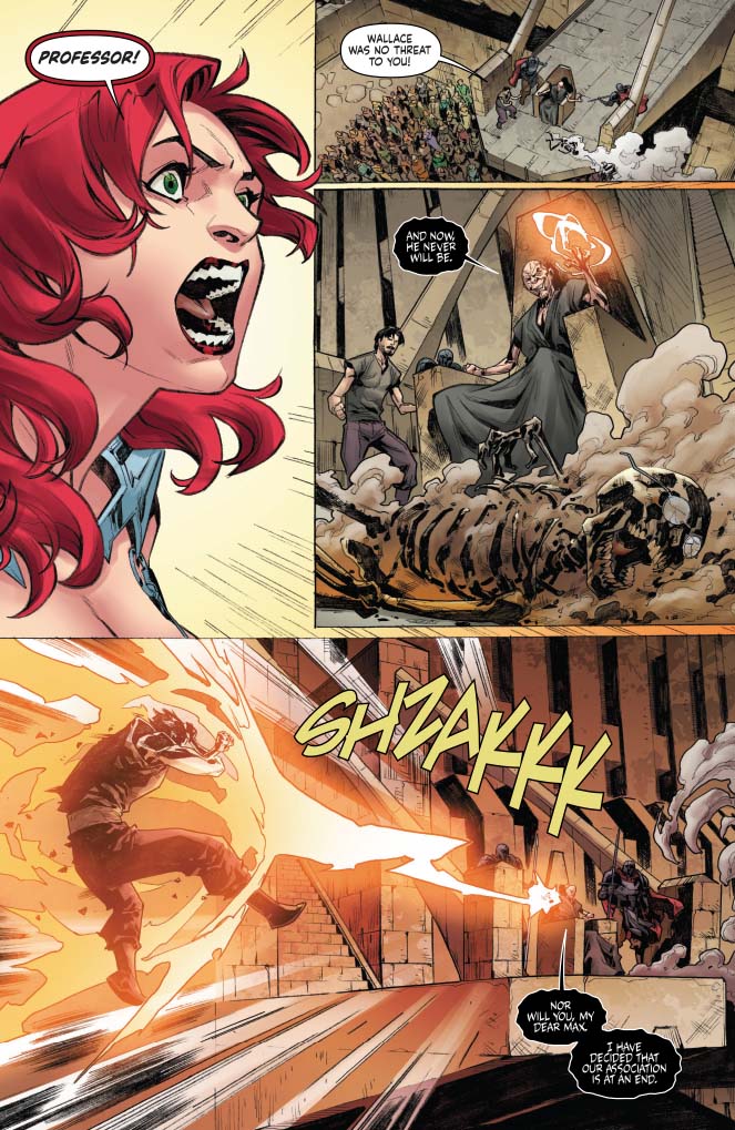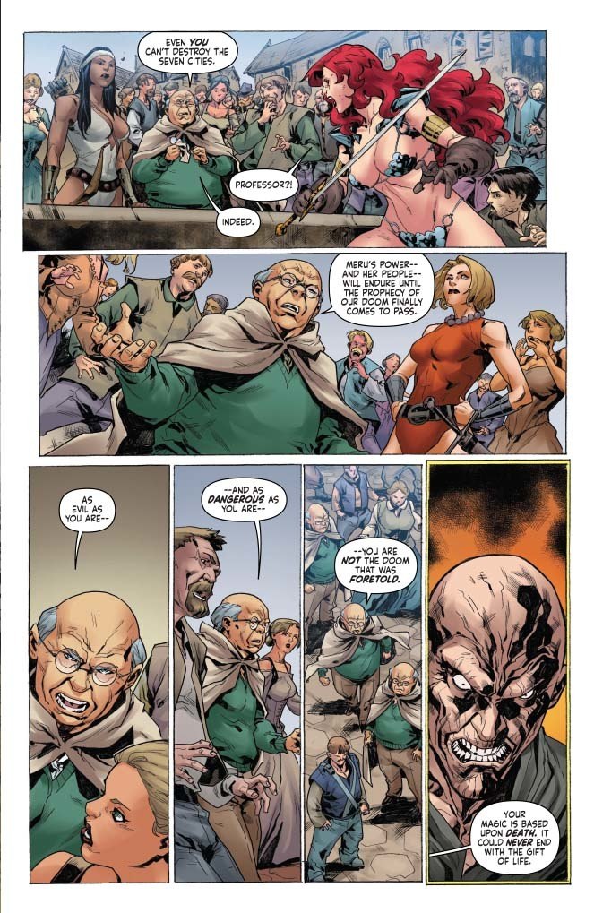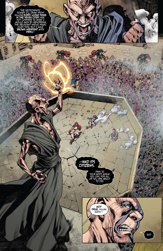 O! M! G! Kulan Gath, the evil wizard, has just put a sorcerous whammy on Professor Wallace, killing him. He did this last issue because Max, our time-lost Meruvian mage, couldn't make the choice of killing Sonja and Wallace vs the entirety of the Meruvian population.