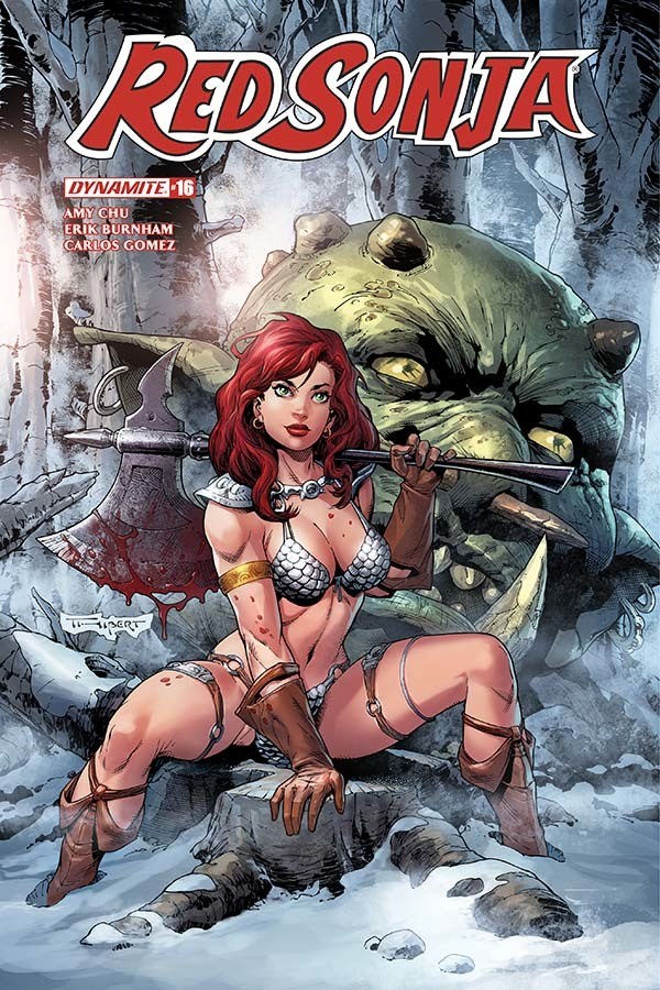 Dynamite has sent us a writer's commentary by Erik Burnham for Red Sonja #16 that he co-wrote with Amy Chu. The book has interiors by Carlos Gomez and covers by Mike McKone, Tom Mandrake and Art Thibert.