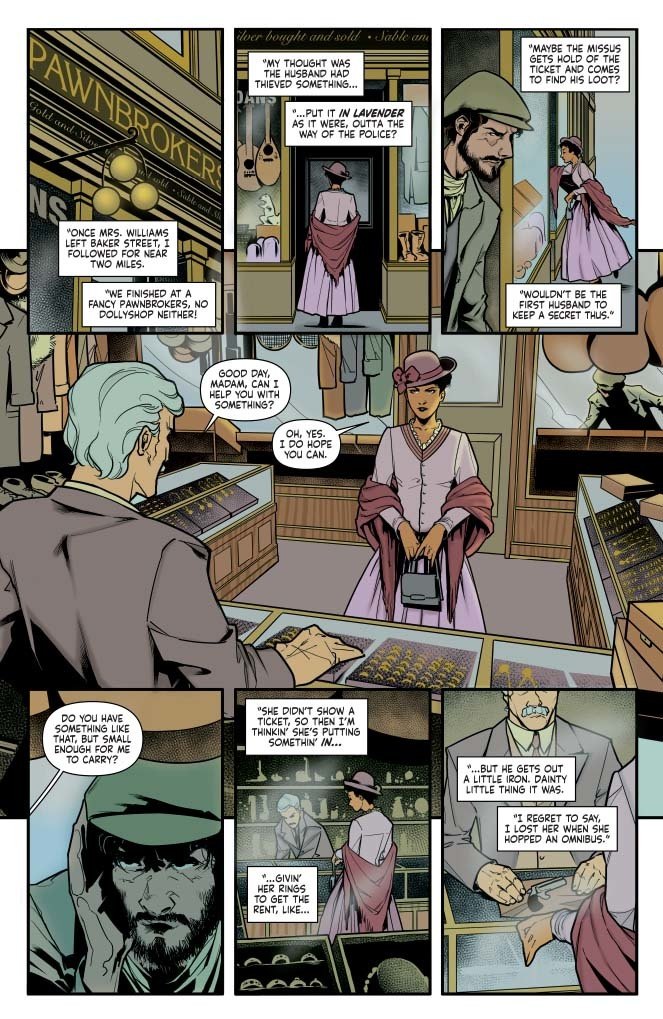 Okay, so last issue we saw May Williams pique The Great Detective's interest. This issue, we follow her to see what she did next. We are not the only ones following her, as she seems to have attracted some kind of ne'er-do-well who is reporting on her movements. What is there to report on? Just a bit of shopping. Nothing untoward.