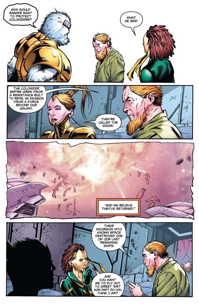 Because so much time has passed in our continuity — millennia, in fact — I felt it permissible to take some artistic license with the look of the Sidari themselves and their ships, which were originally drawn by Colleen Doran. Andrea updated the look of the ships while still keeping to the spirit of Colleen's original designs. Butch Guice did the same with the Sidari themselves.