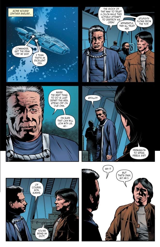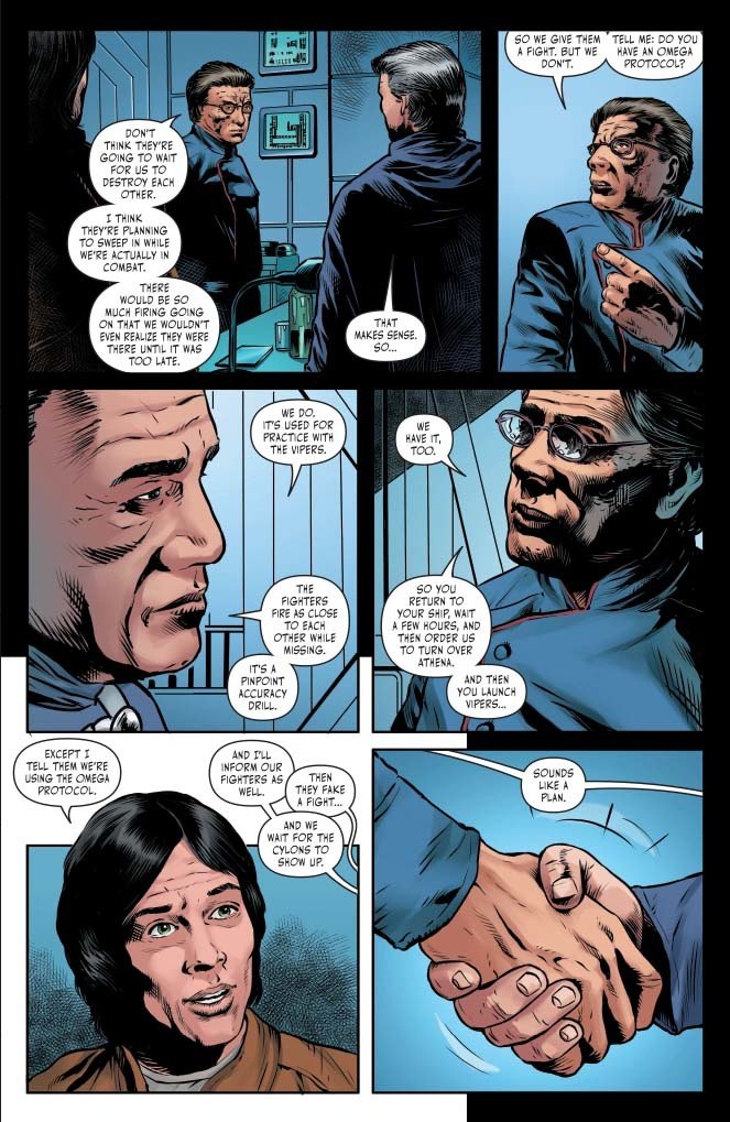 I loved writing this scene. See, I knew that in a previous issue, fans were going to hate the fact that where I left it, the two Adamas would seemingly have been fooled by Kali's machinations. Which they were, for maybe sixty seconds. And then they both come to realize (well, Gen one Adama is convinced) that something isn't right and they come together to thwart whatever it is that Kali is up to. So I'm expecting that a lot of readers are going to be sighing in relief that I didn't paint our guys to be quite as gullible as all that. In BSG, nothing is what it seems. We suddenly have our explanation of the Omega Protocol, and we can now reread the dialogue of the Vipers' encounter for what it is: Everyone has come to realize that this whole thing is a scam. They have to make it look good while waiting for the Cylons to make their move.