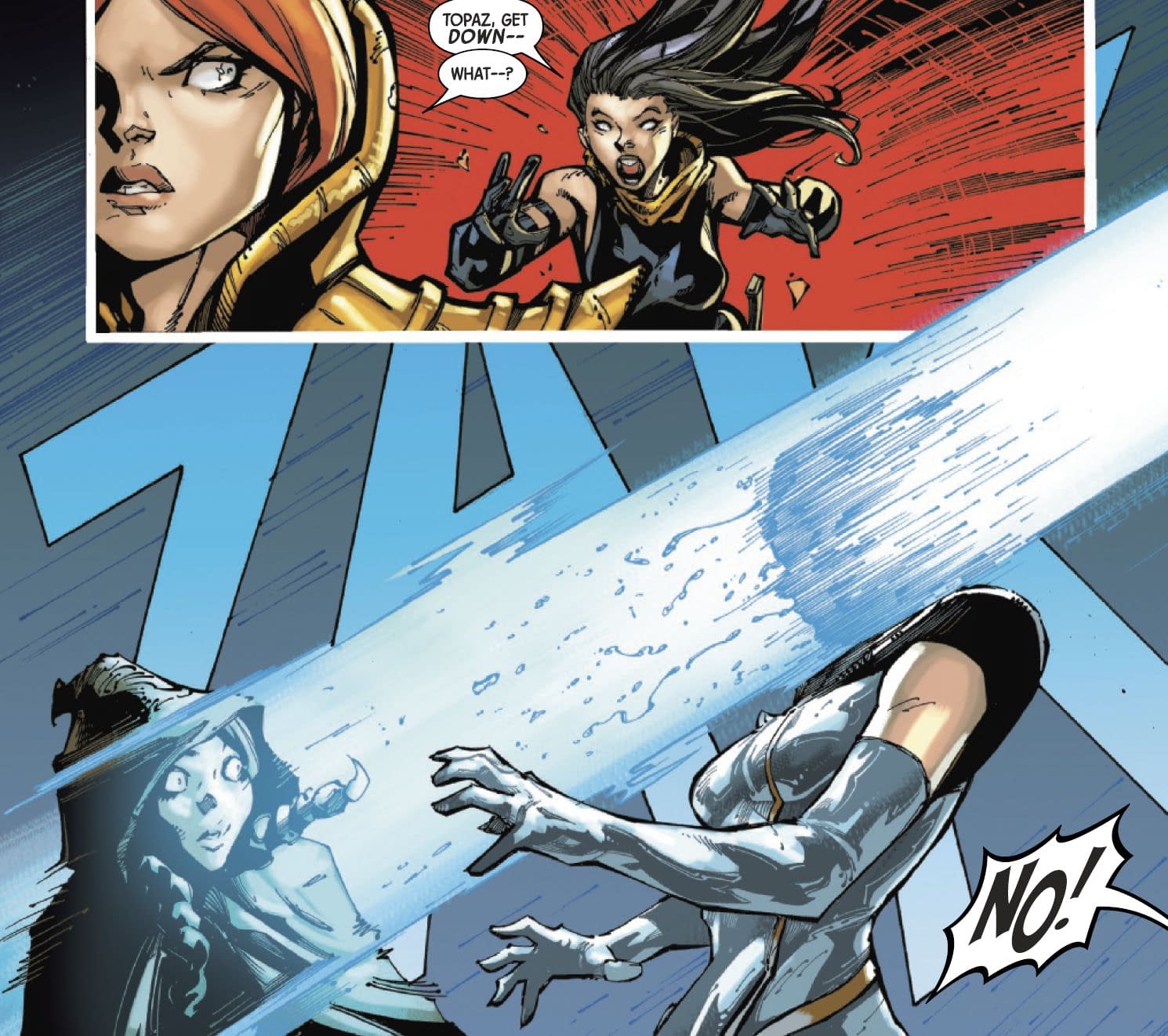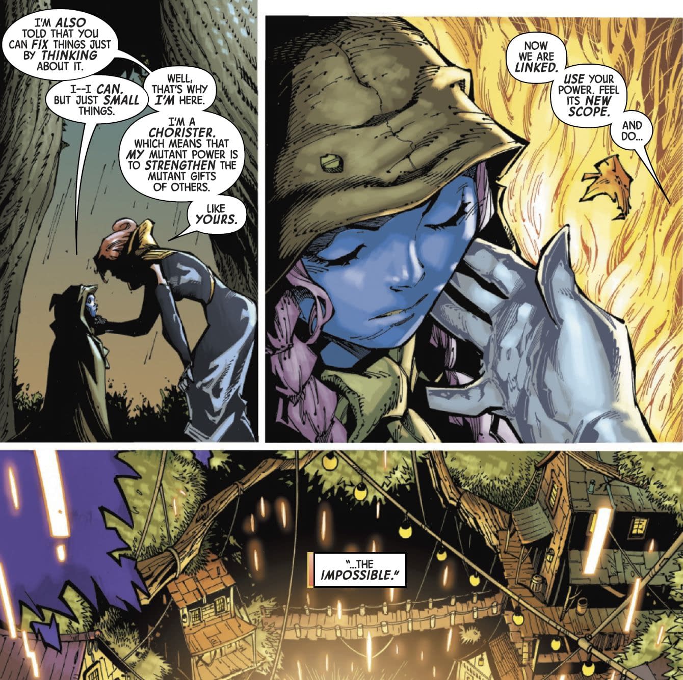 The Choristers of Doug Ramsey, or Revelation, can indeed post Doug Ramsey's powers, but also those of any mutant. So Topaz is doing well here, boosting the repair of a damaged settlement. But she is still also one who boosts Doug Ramsey… and is looked after by Kwannon's Psylocke.