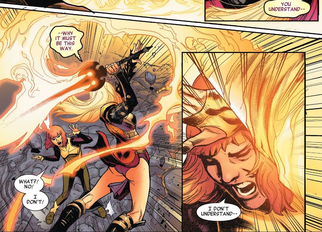 We don't understand either, Jean. After Magik "kills" Jean, Jean wakes up in a new afterlife. This time, she's been transported into an overhyped, throwaway story from the Marvel Legacy one-shot, truly a hellish punishment, where she encounters the Phoenix of 1,000,000 BC. That goes about as well as the Magik thing.