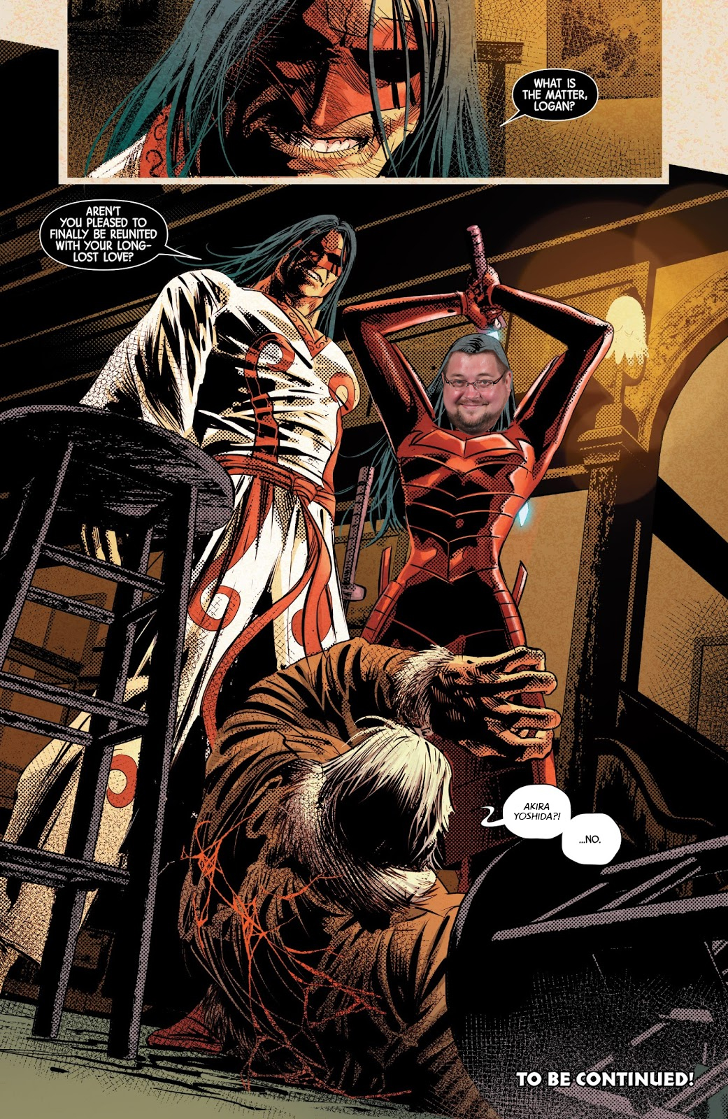 We're joining a storyline in progress here. In the story so far, Logan has traveled to Japan where he's discovered that Clan Yashida is developing a healing factor drug called Regenix. But The Hand wants the drug, too, so they've initiated a hostile takeover of Clan Yashida, dispatching with the Silver Samurai and replacing him with the mysterious Scarlet Samurai. The previous issue ended on a cliffhanger, with Logan about to be killed by the Samurai, who has been revealed to be…