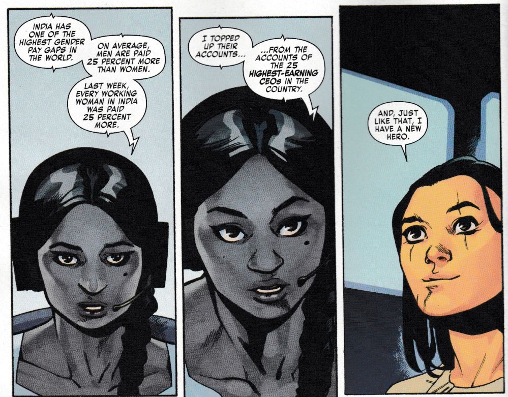 She is a technopath, able to control computers and whatnot, and from India. Oh and with a concern for the gender pay gap that has been in the headlines of late.